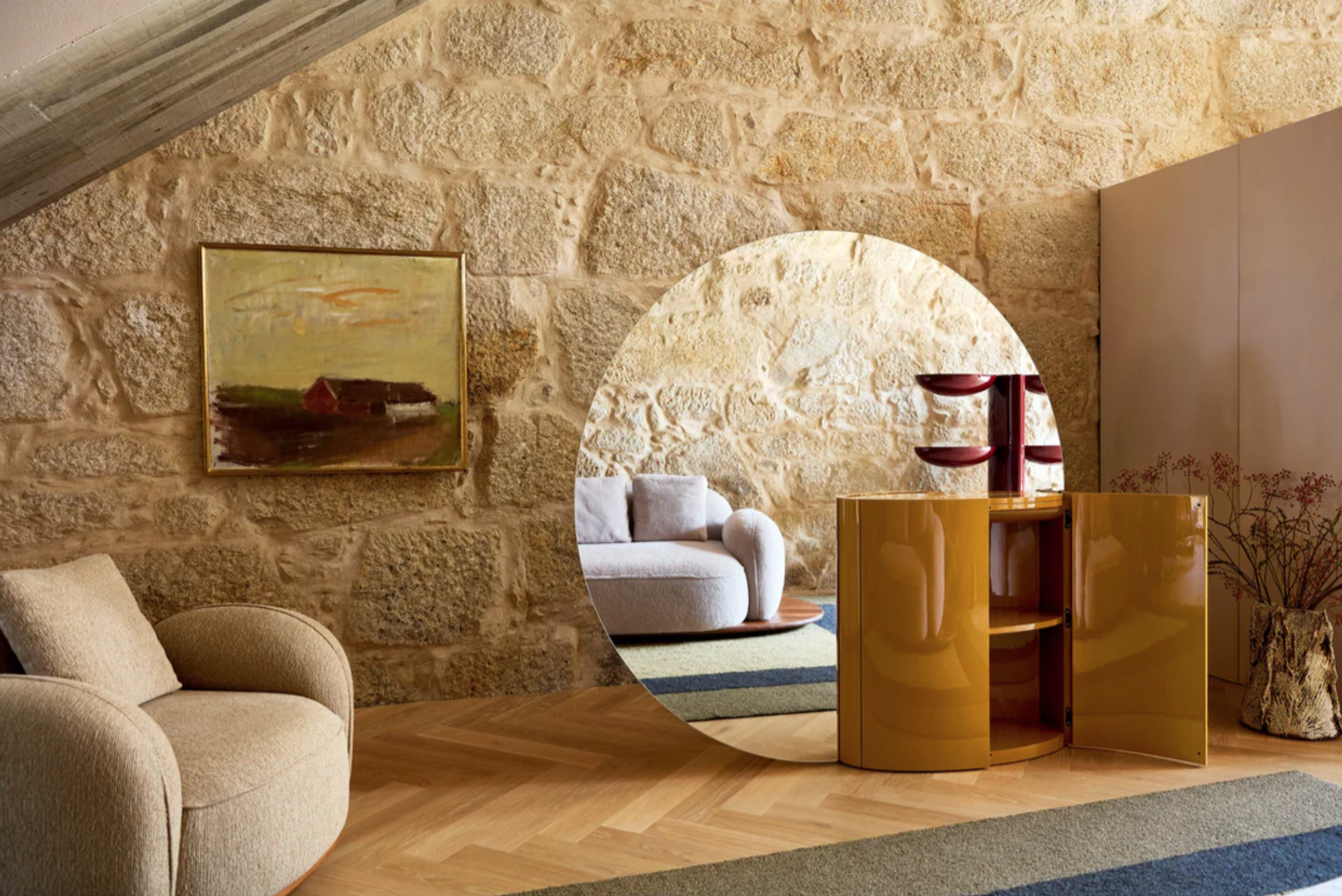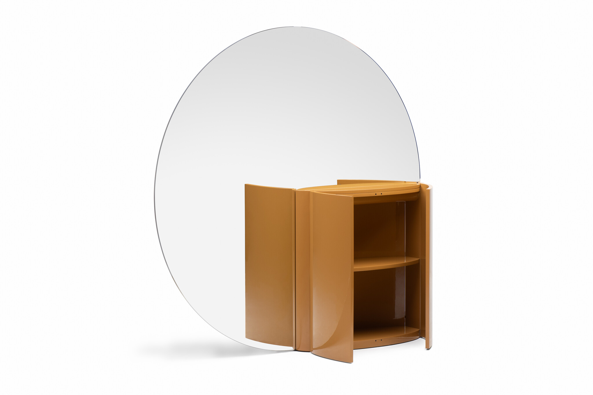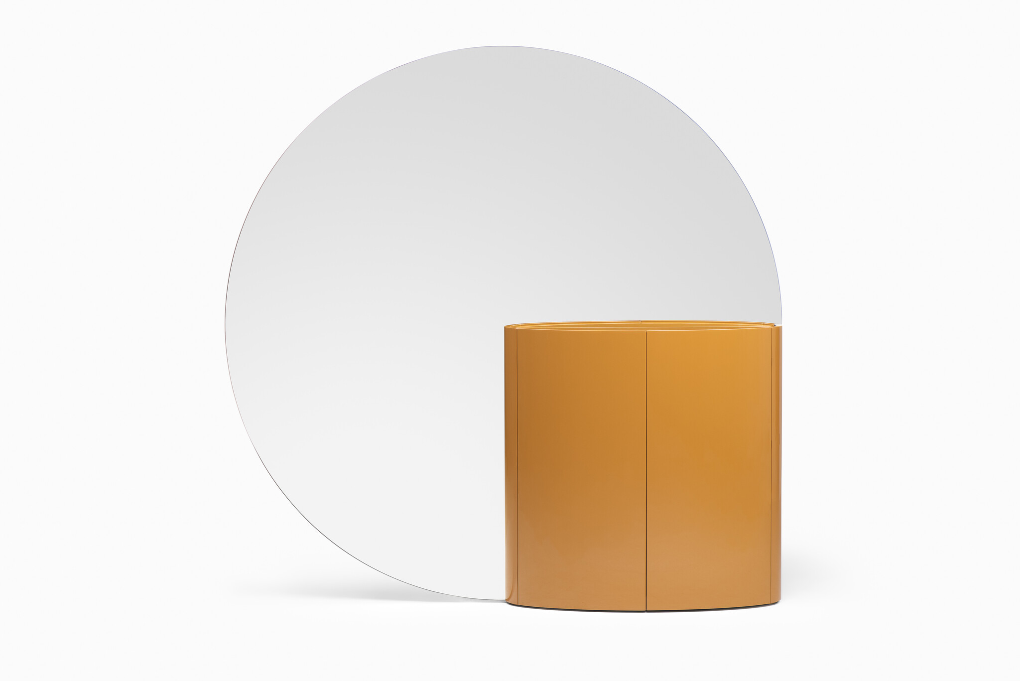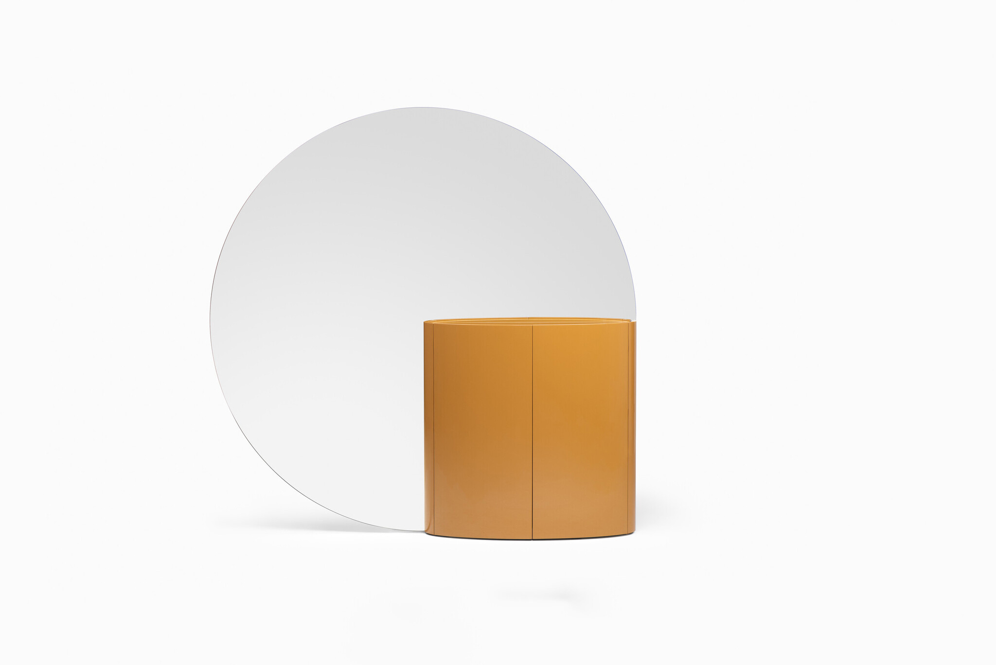 Tai In plays with reflection and its powerful effect on perception. Its large round mirror divides and reflects space, while its integrated cabinet provides practical storage space. There is no back or front: the mirror is double sided, as is the cabinet which opens on both sides.