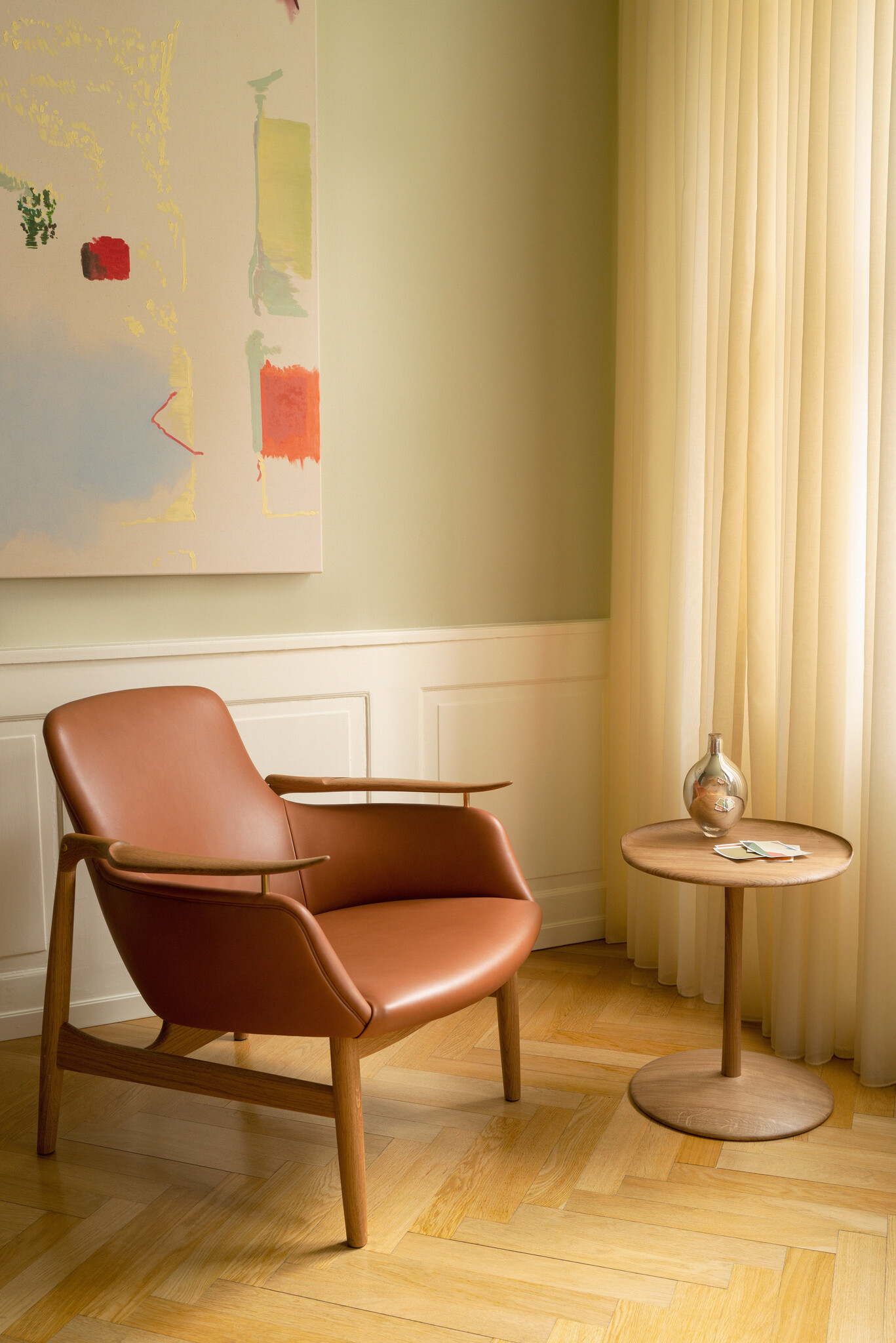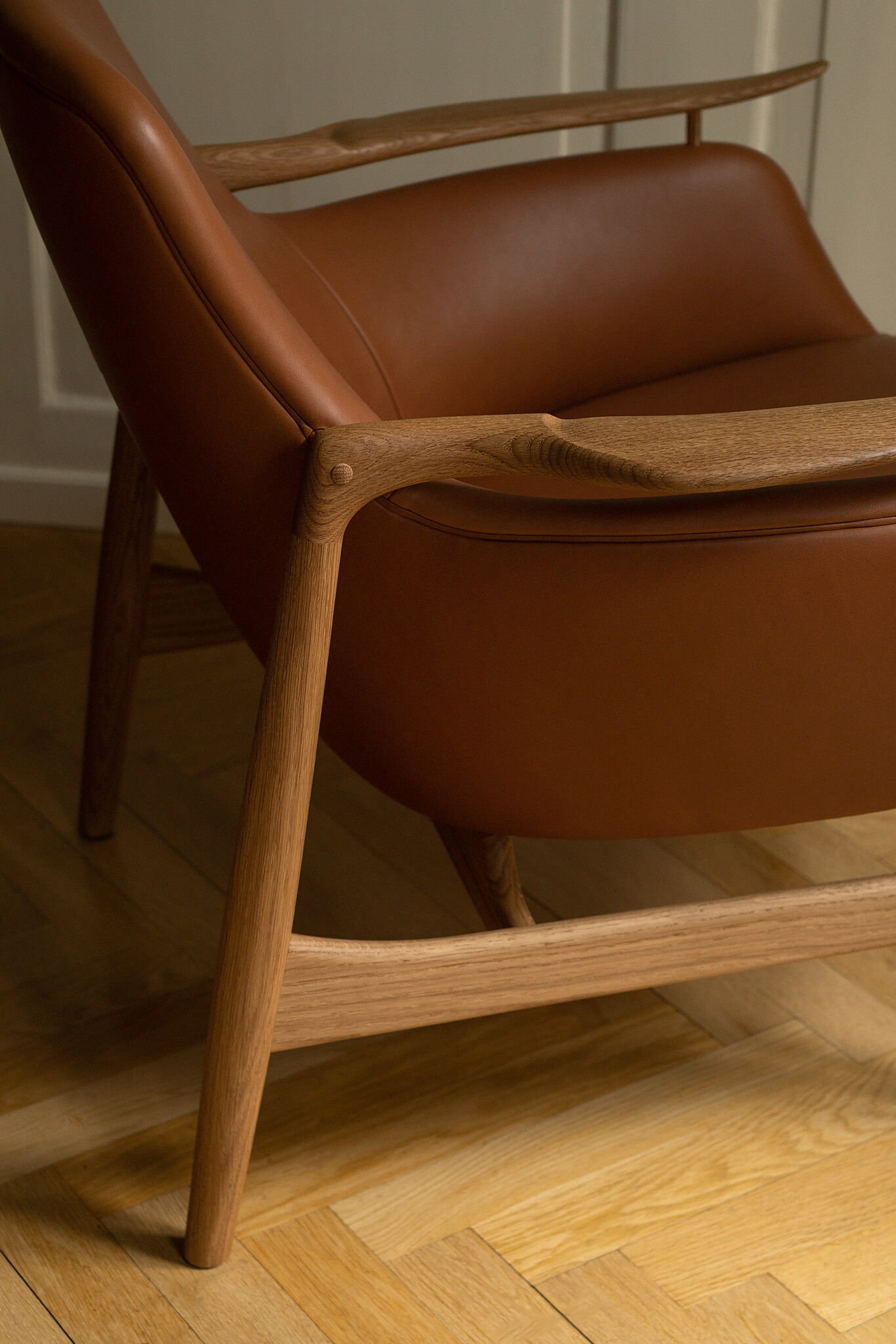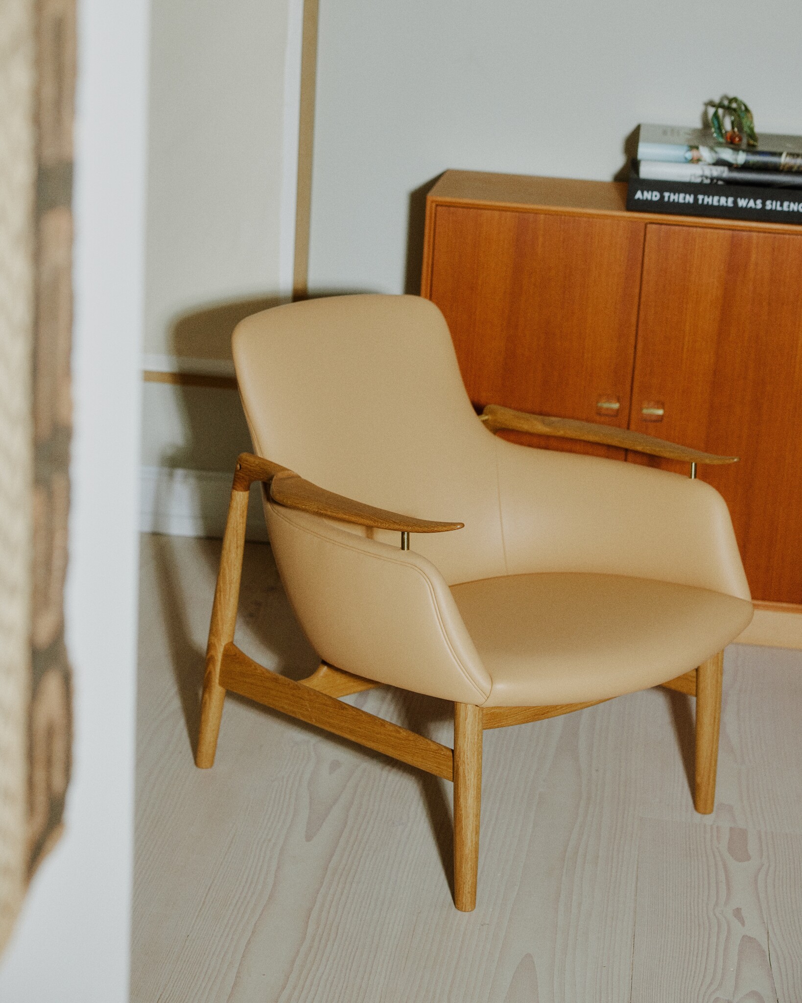 Finn Juhl's characteristic design feature of separating the carrying elements from the carried is also at play in the FJ 53. However, this time the separation is achieved via more sophisticated means to add-in the aforementioned lightness and elegance. The rear legs, completely free from upholstery, protrude from the floor. In a single, unbroken motion they change direction and expand into an organically shaped armrest, almost animalistic in nature. The armrest wraps around the upholstery as if it is levitating, to arrive in a smooth and upwards point, begging to be touched.