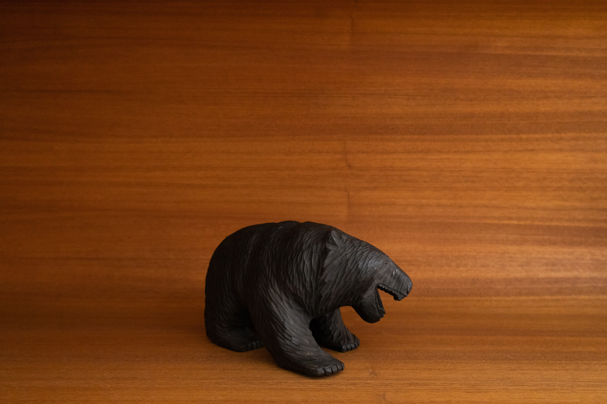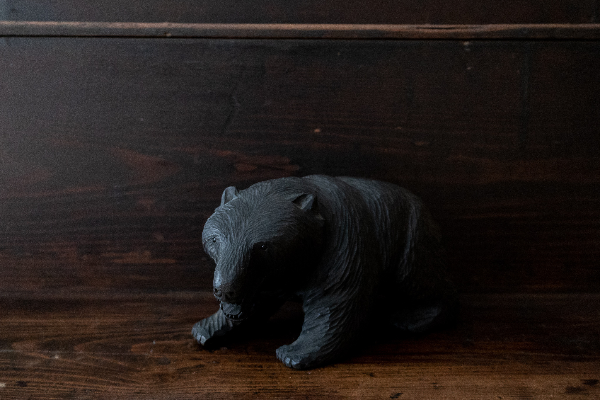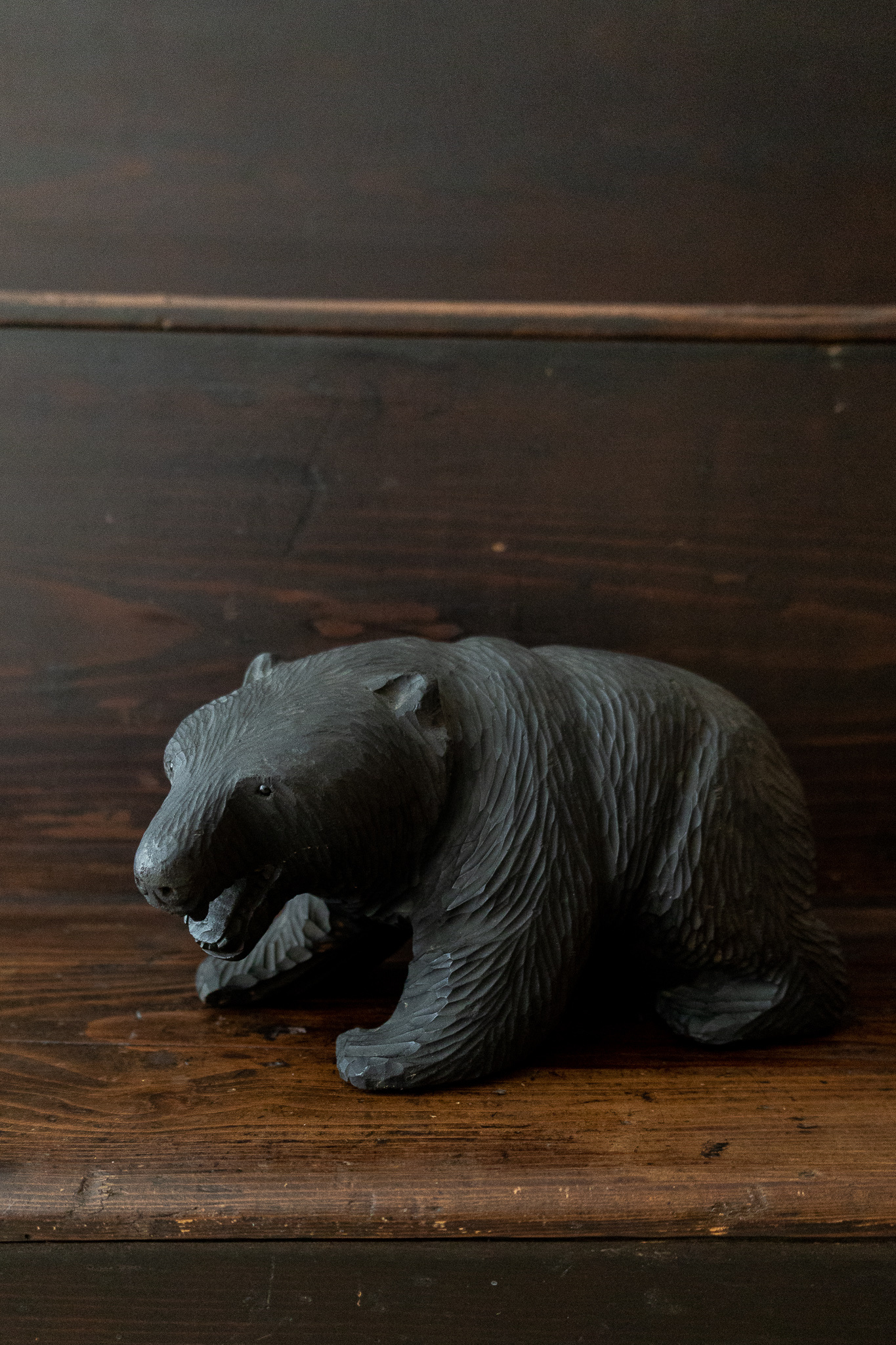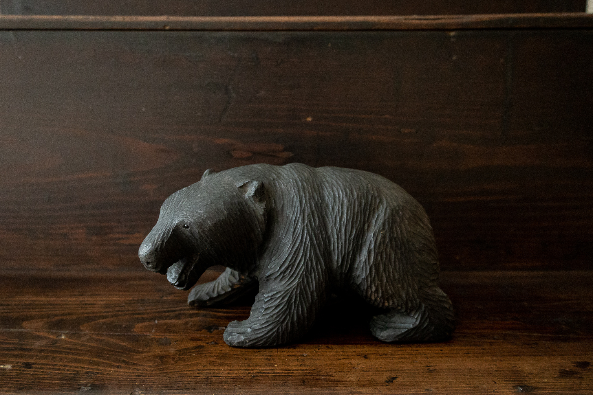 A particularly interesting carved bear from Northern Japan. This bear is known as the "barking bear" as its mouth is open as if giving a warning roar. There are a few styles of these bears including version that a fish in the bears mouth which is also pleasing but more common.