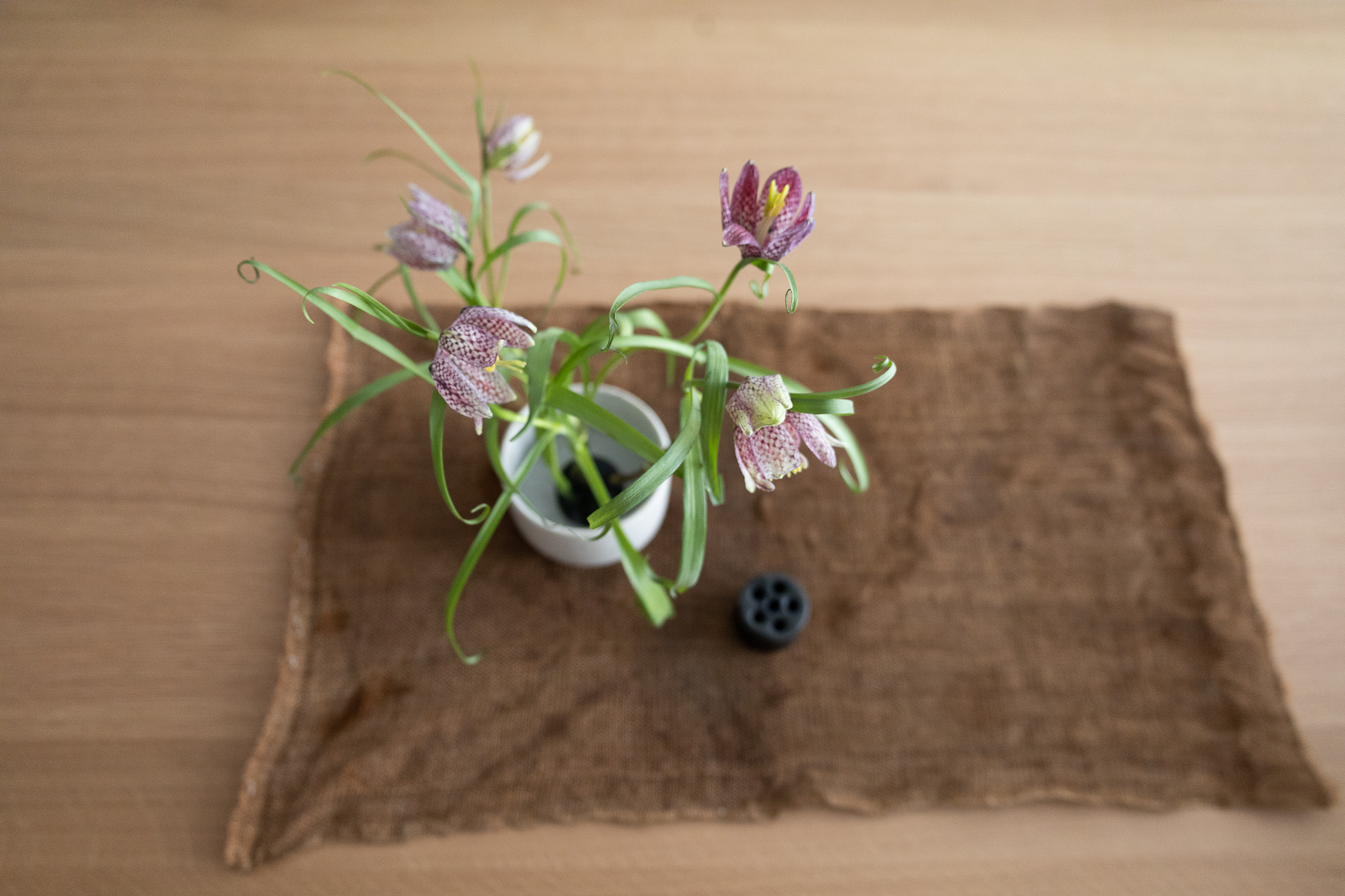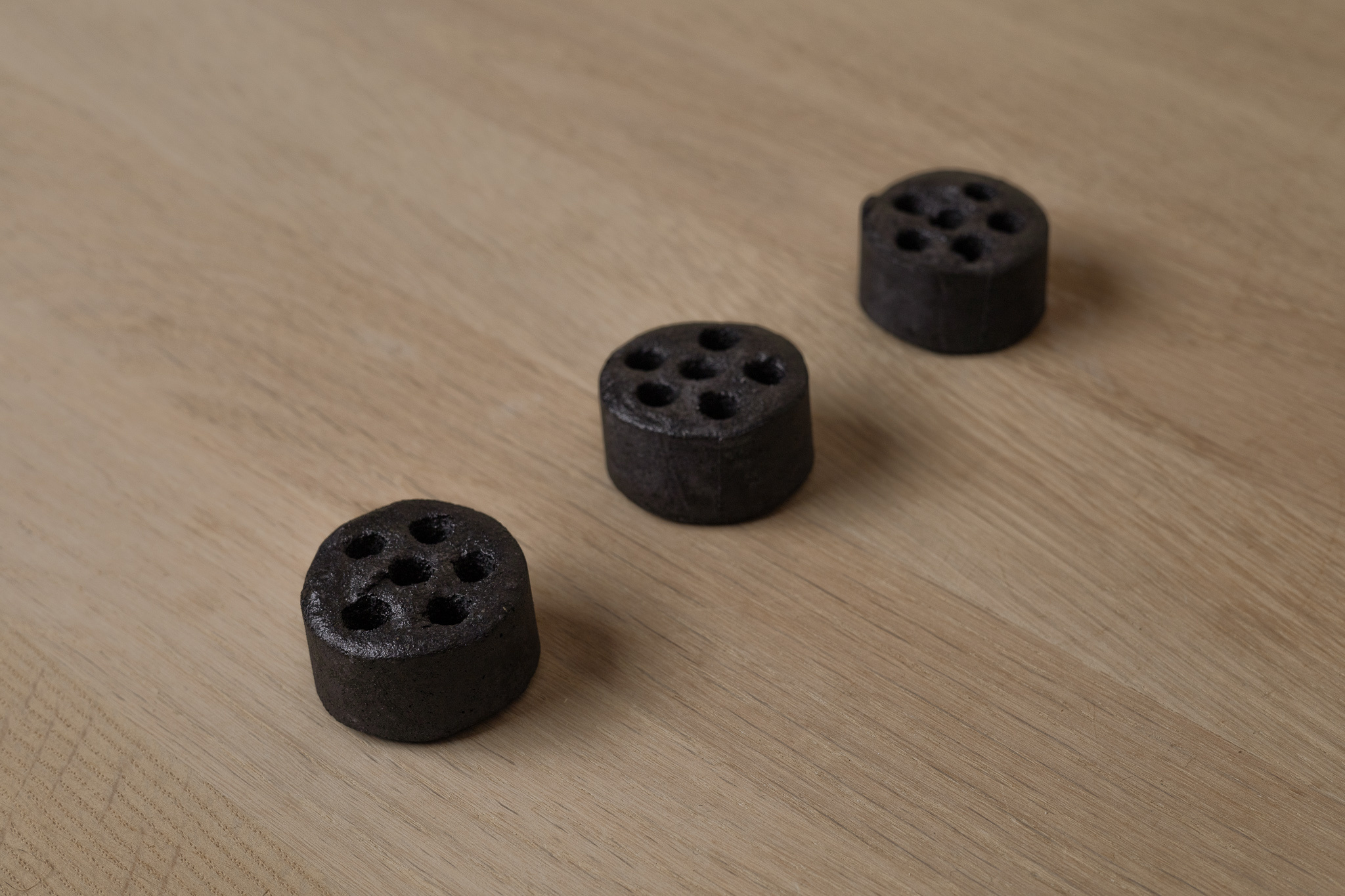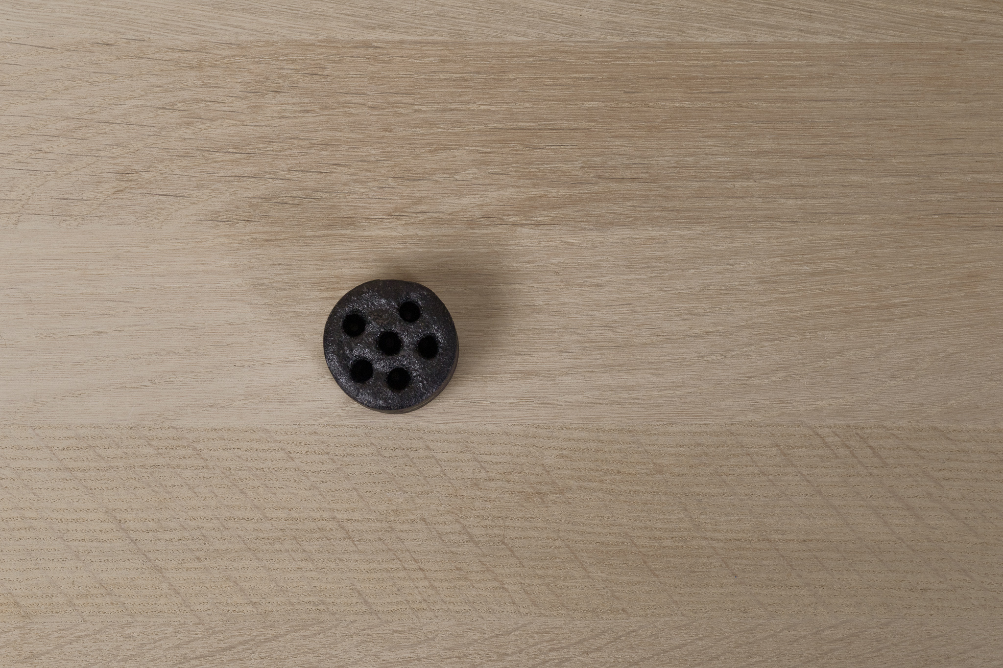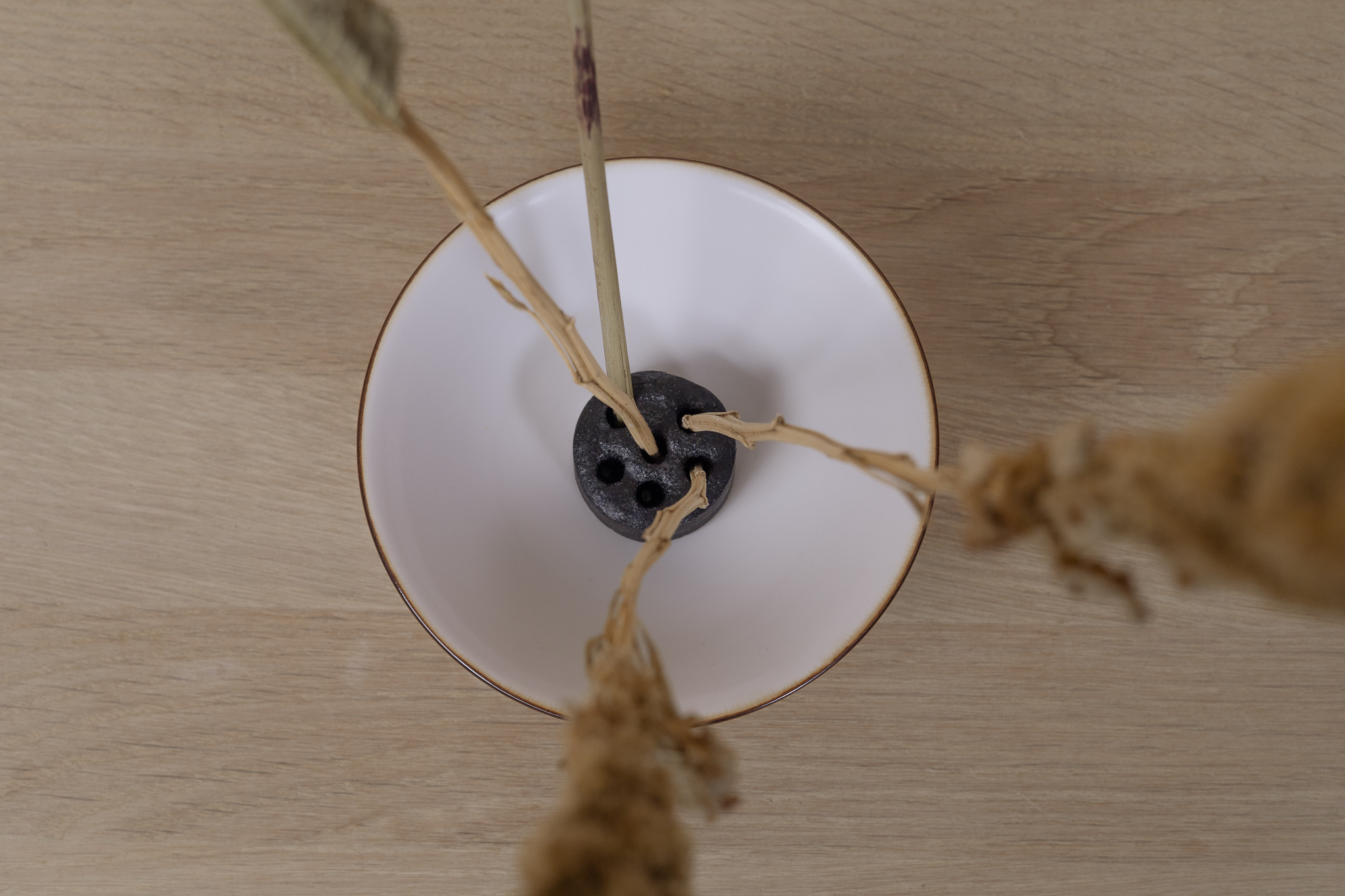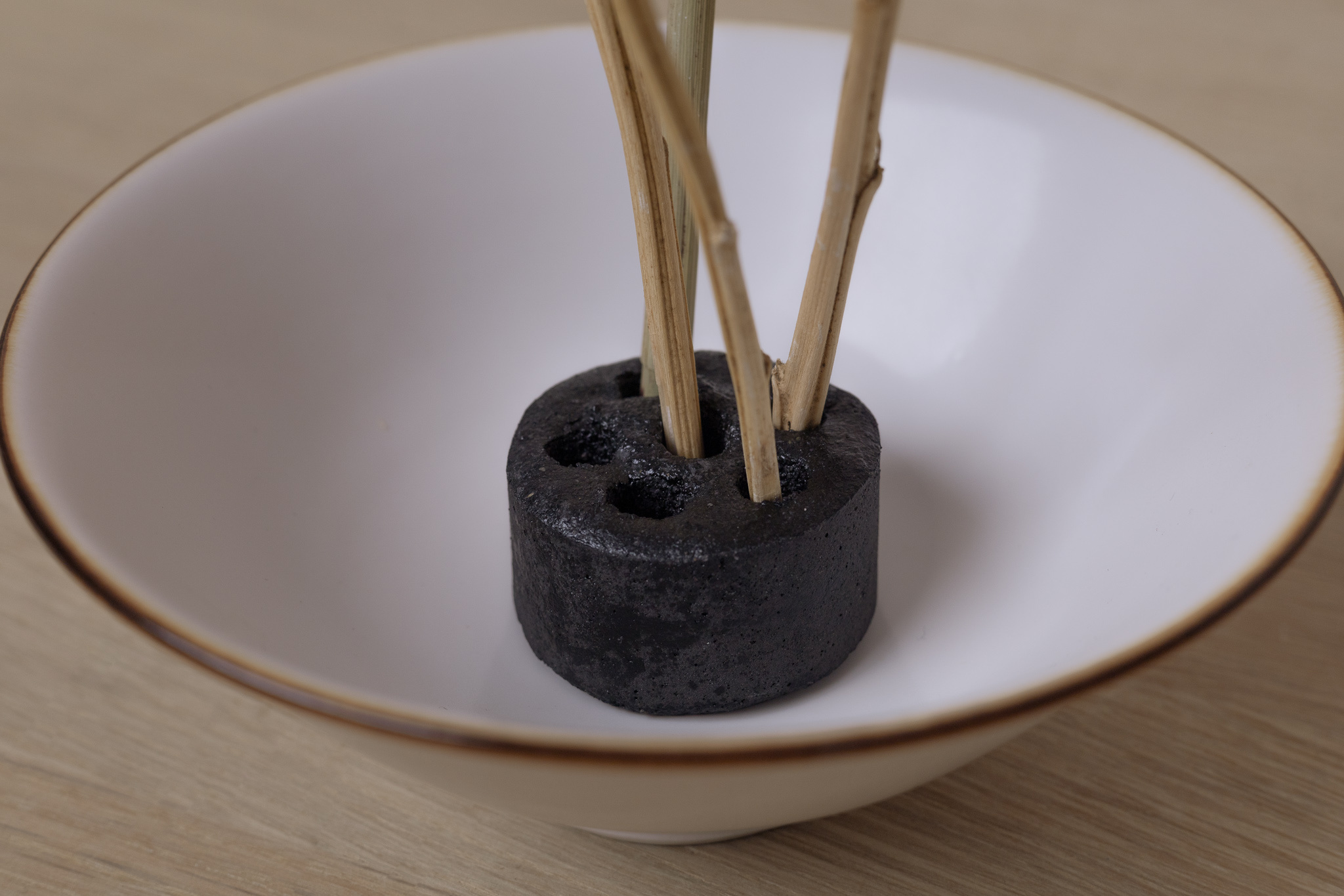 This is a flower holder crafted with powdered bamboo charcoal. Simply insert flowers or leaves into the holes, and it transforms into a small dish or bowl for floral arrangements.