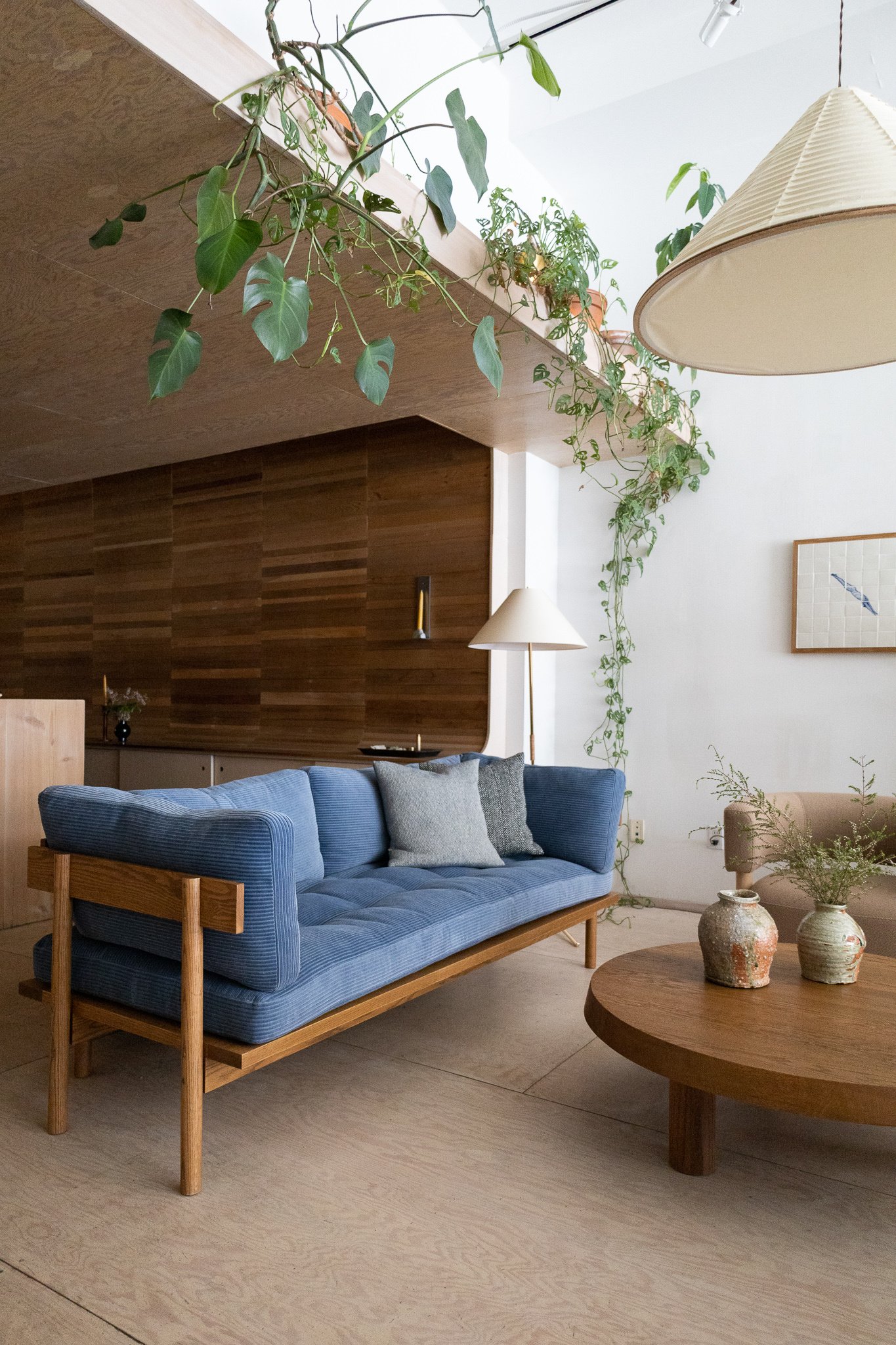 Continuing our long time collaboration with Thom Fougere we’re offering a special new finish for the arm sofa, round coffee table and Tambour cabinet. The finish is inspired by the beautiful elmwood used in French modernist furniture (think Perriand and Chapo). We looked into sourcing elm, but the quality wasn’t good enough especially considering all of our pieces are made from solid substantial lumber. The next best idea was to develop this special smoke oil finish on our usual oakwood. We are absolutely thrilled with it! It’s a very similar effect but in a much denser and harder wood (not to mention, local).