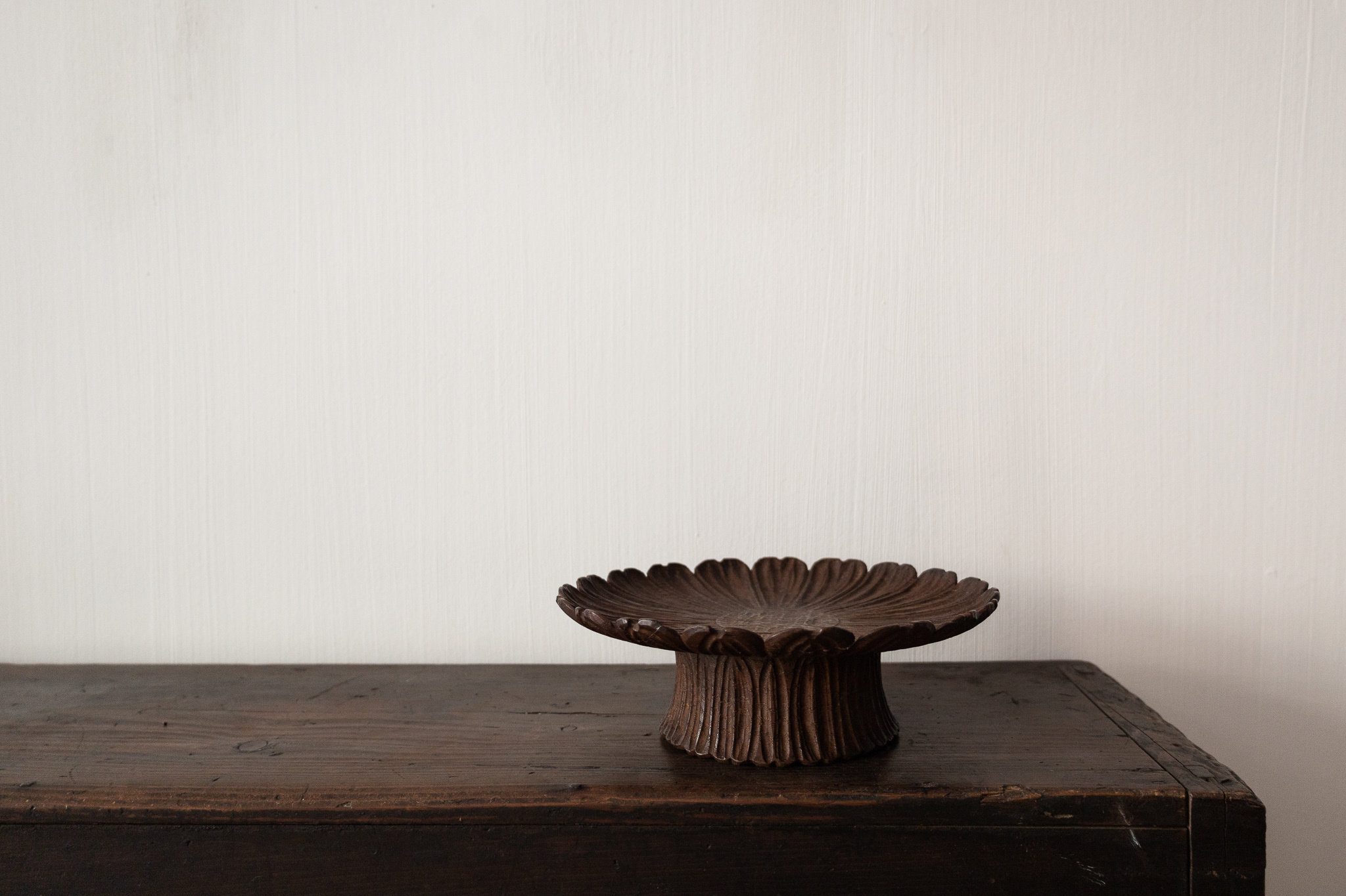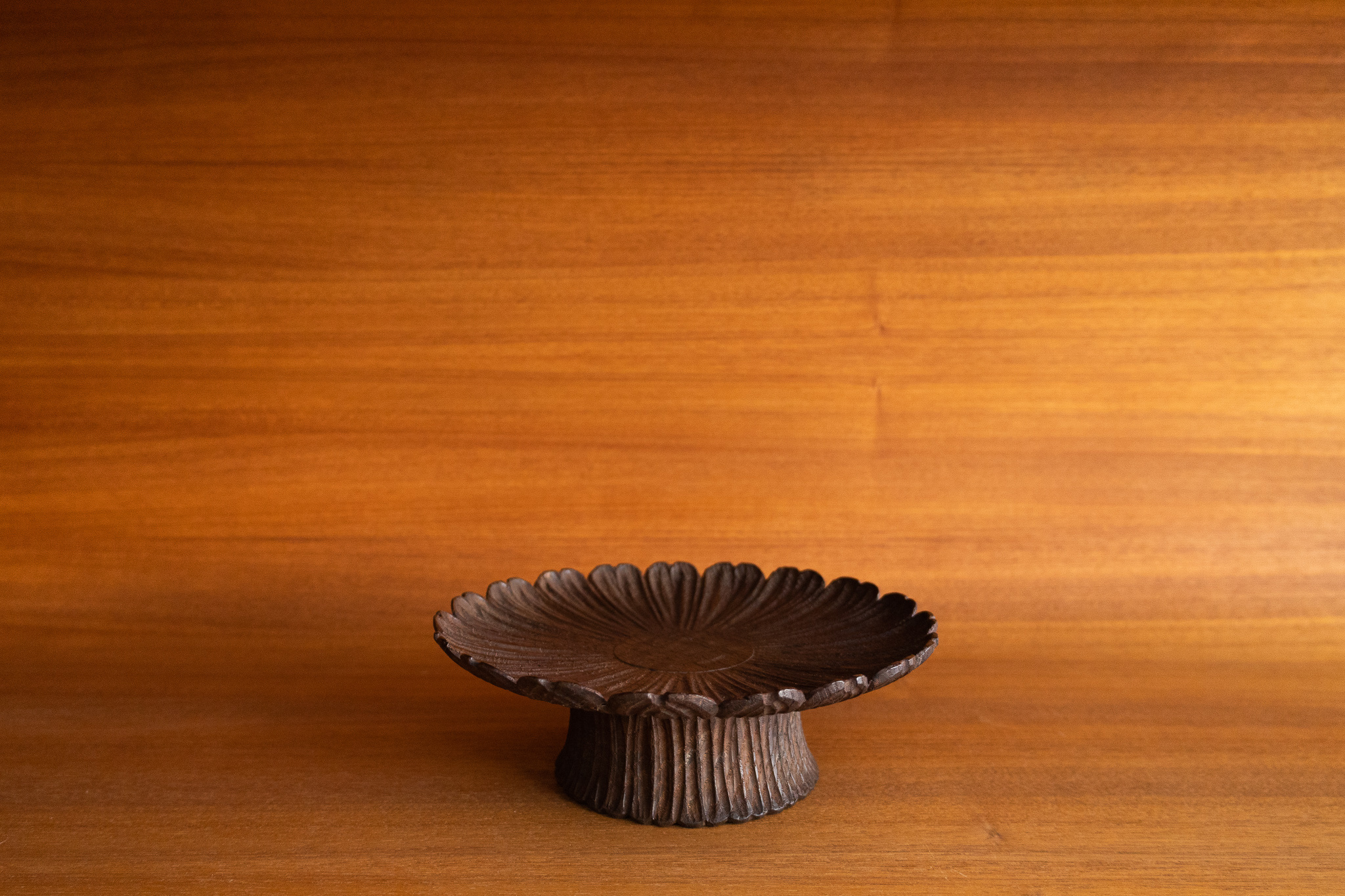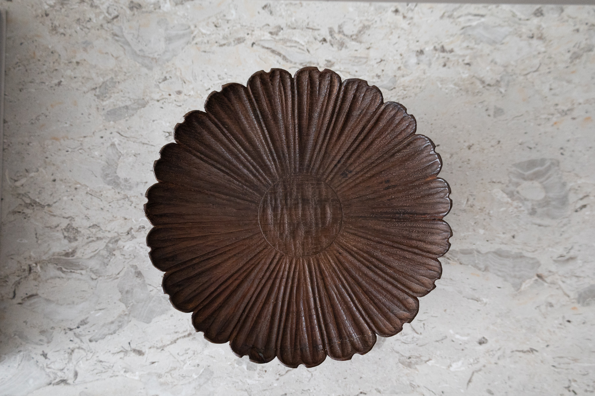 An intricately carved chestnut pedestal in the shape of a Chrysanthemum. Incredible workmanship! Includes signed box.