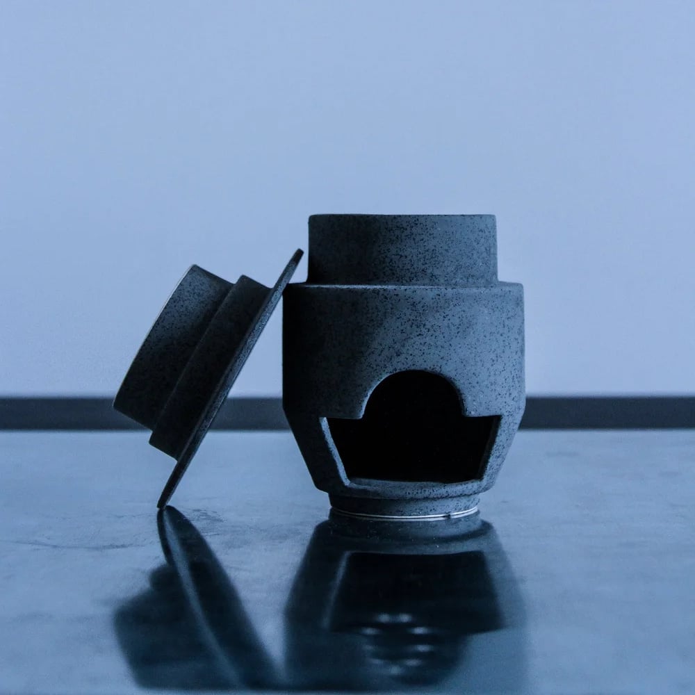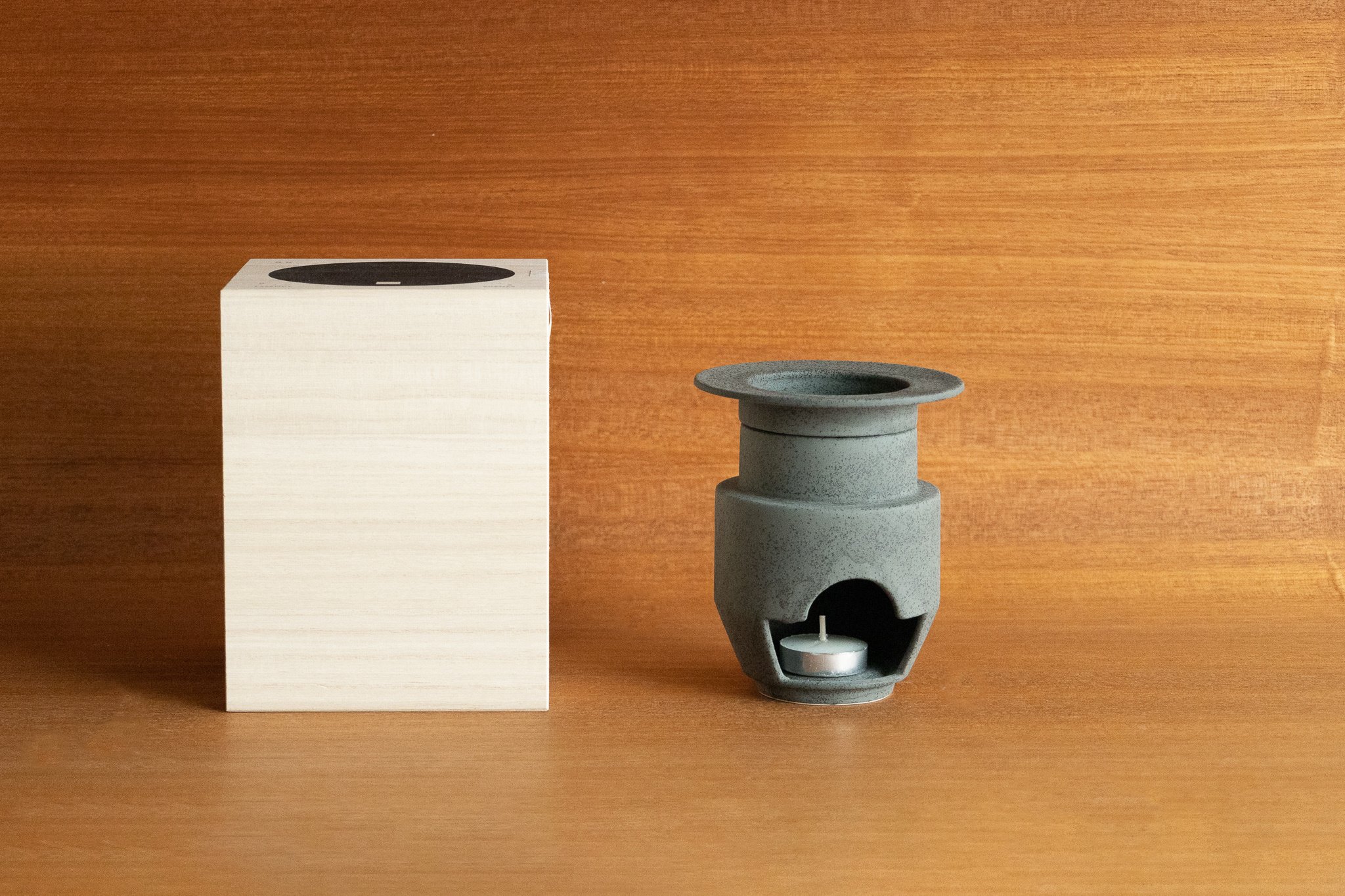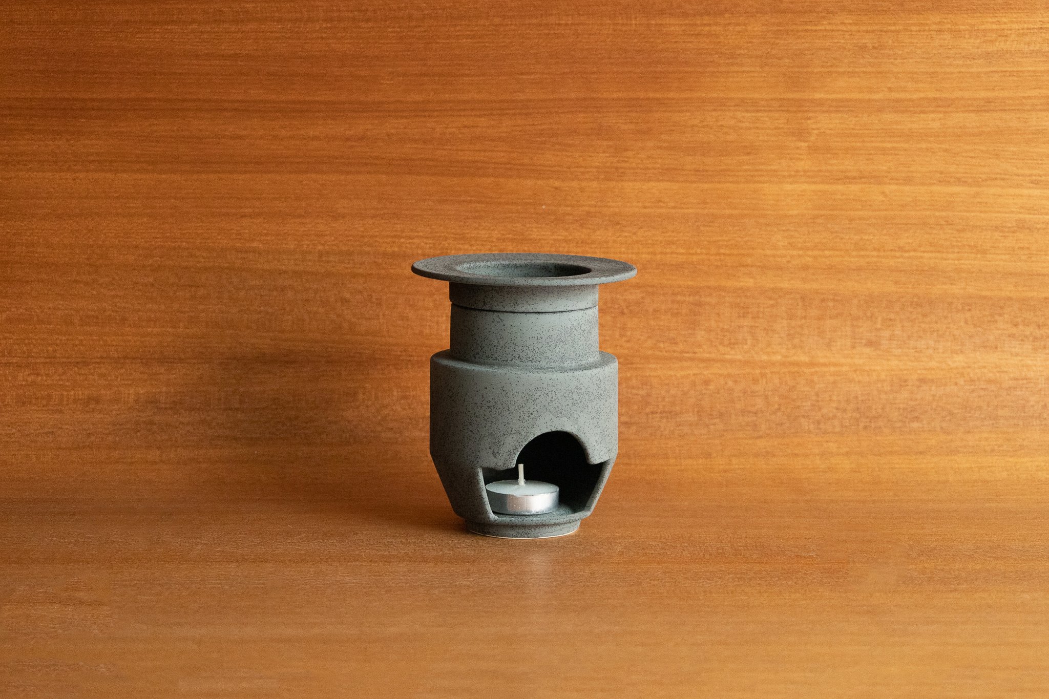 Composed of two cylindrical elements, this Essence Burner is to be used with water (or scented wax) and a tea light candle that illuminates the space and gently heats the top ceramic plate to give off scent. Made with a bespoke mixture of clay and hand pouring method in Gifu Japan, its textured and stony ceramic surfaces gives peaceful presence during the day, while it contrastingly exposes deeper grow in the dark.