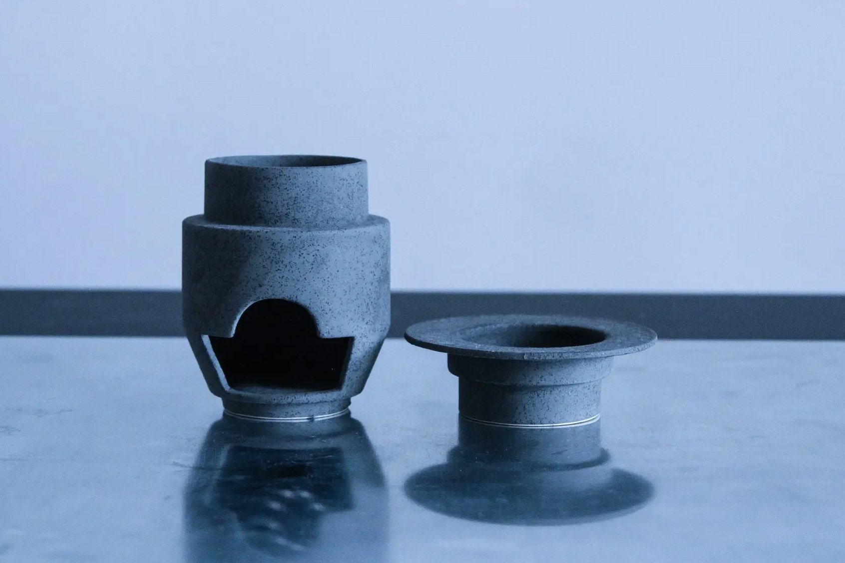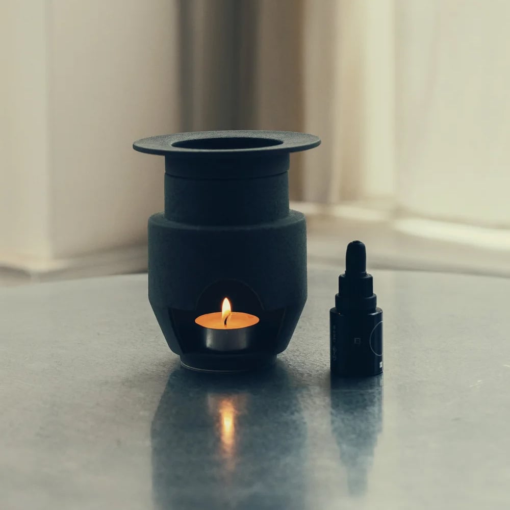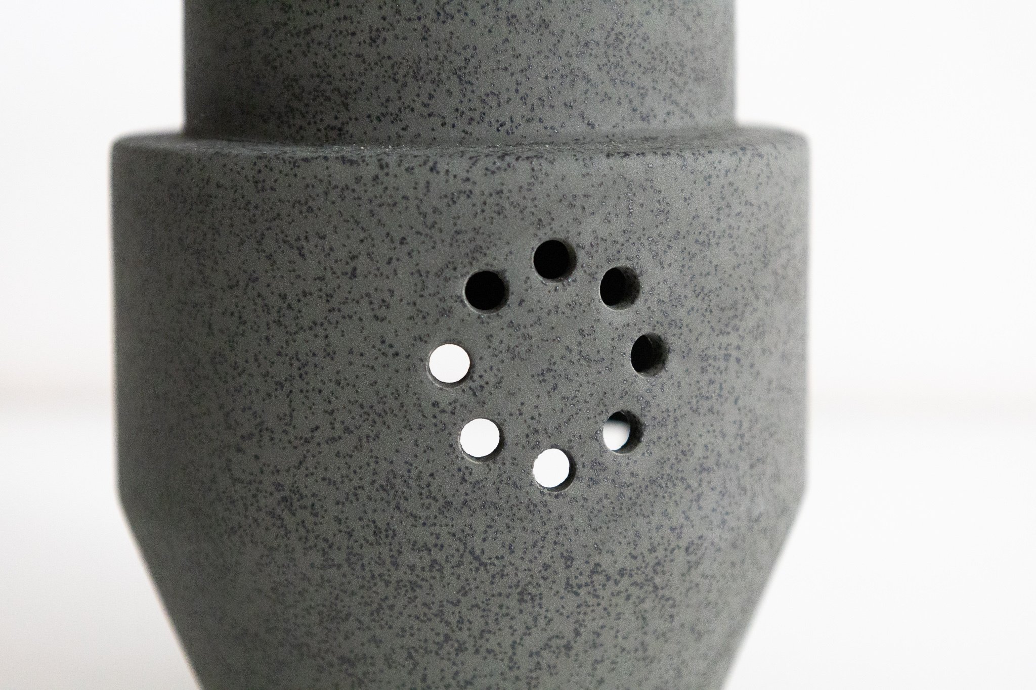 Composed of two cylindrical elements, this Essence Burner is to be used with water (or scented wax) and a tea light candle that illuminates the space and gently heats the top ceramic plate to give off scent. Made with a bespoke mixture of clay and hand pouring method in Gifu Japan, its textured and stony ceramic surfaces gives peaceful presence during the day, while it contrastingly exposes deeper grow in the dark.