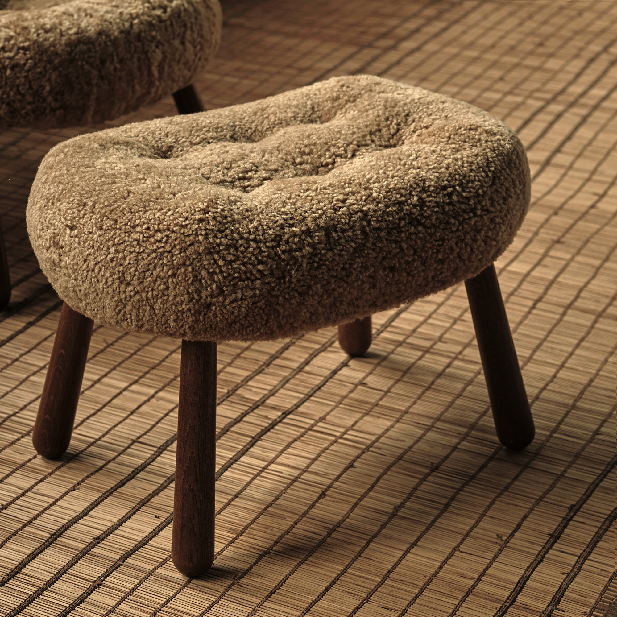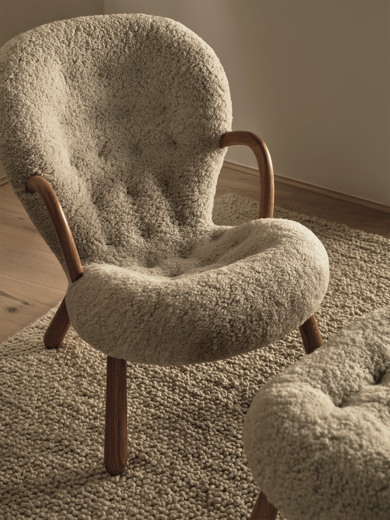 Colour & Materiality Sheepskin upholstery, oak or walnut legs.