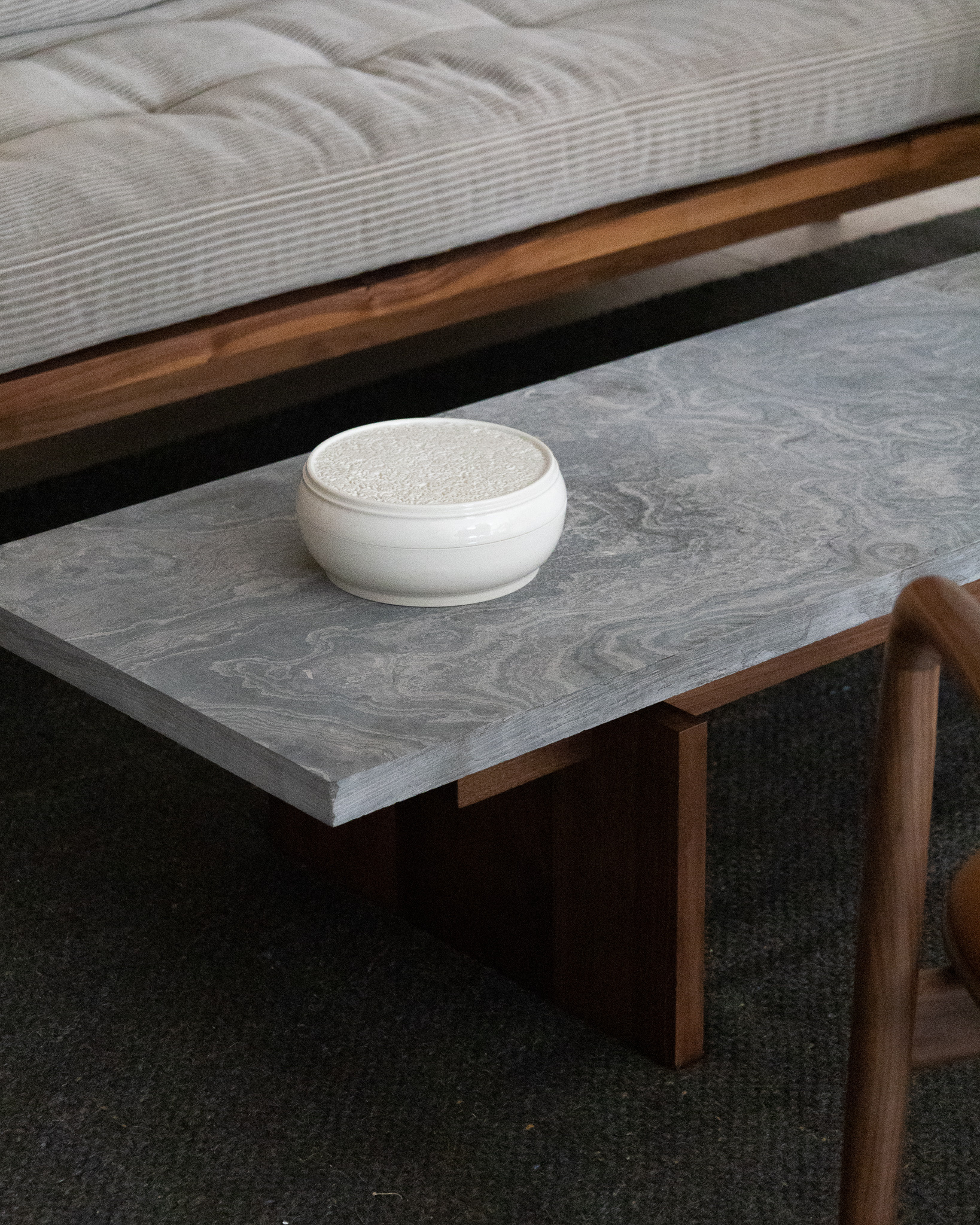 Thom Fougere's coffee table is a continuation of our exclusive line of furniture, which began with the daybed in 2020. Archetypal in form, it is a study in reducing the table to its essentials: a floating slab of limestone atop a wooden frame of intersecting planes. Its simplicity and bold clarity of construction emphasizes strong horizontal lines articulated with fine details.