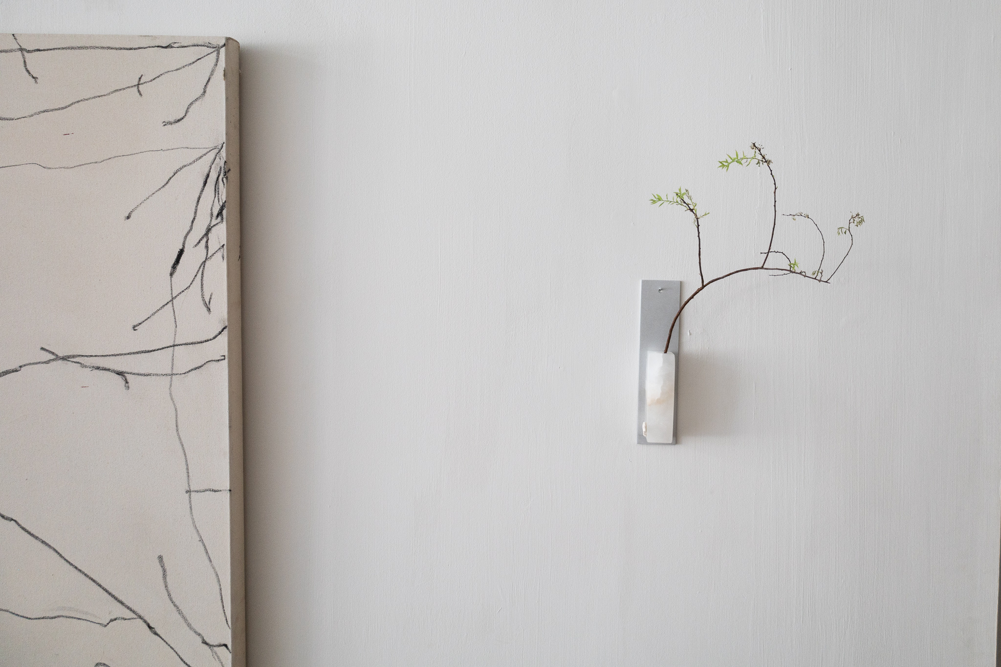 A wall vase made from Alabaster and inlaid with alabaster dust leftover from the carving process. Handmade in Toronto by Elizabeth Lenny.