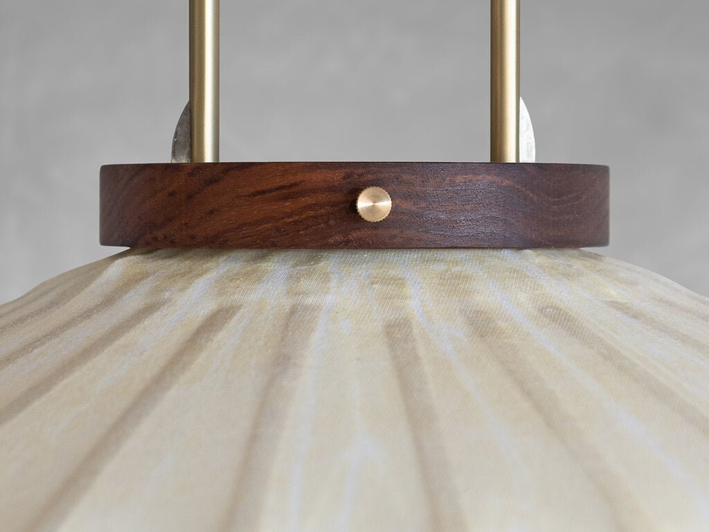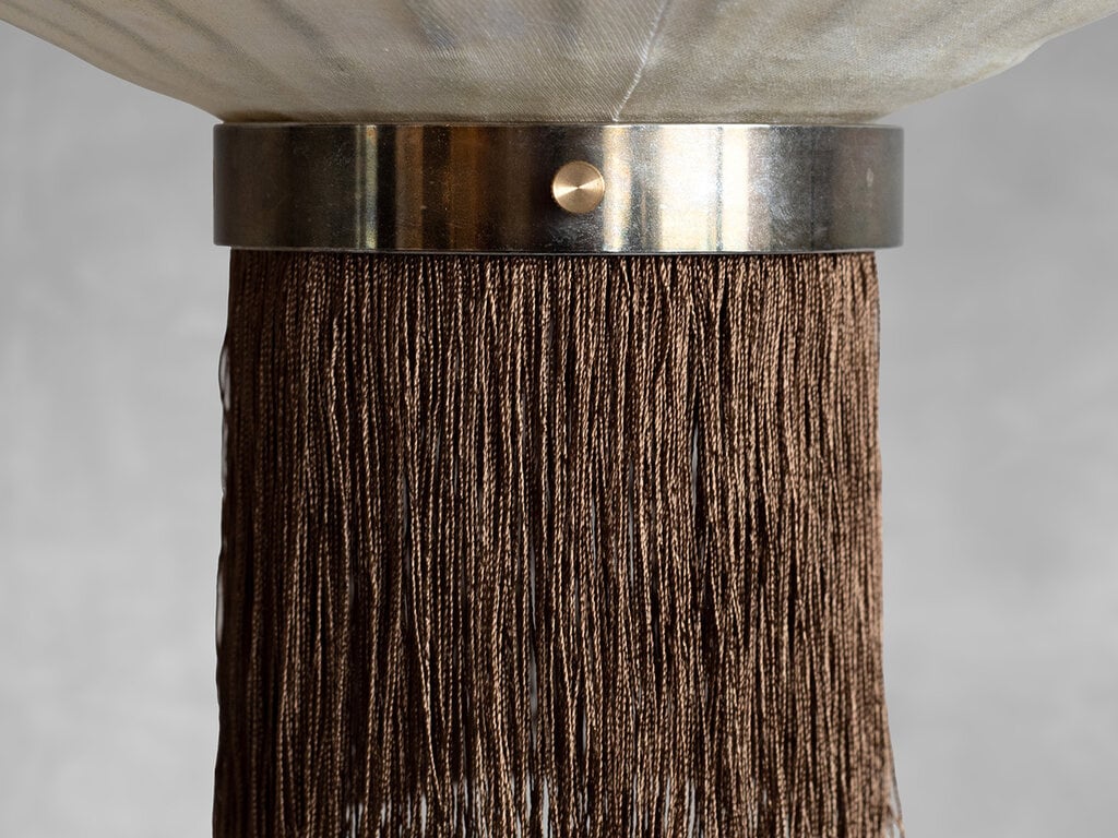 Material Walnut & bamboo frame, Hand-colored TC fabric, Metal pipes & ring, Rayon fringe