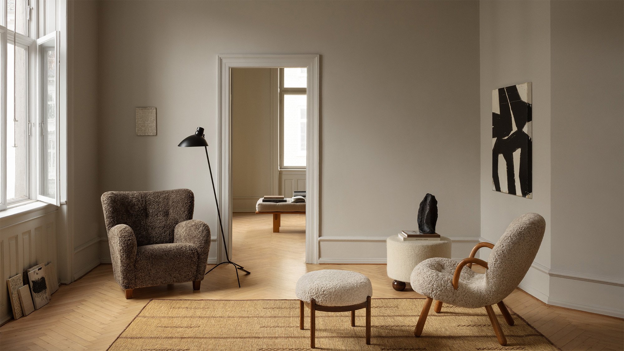 Colour & Materiality Sheepskin upholstery, oak or walnut legs.