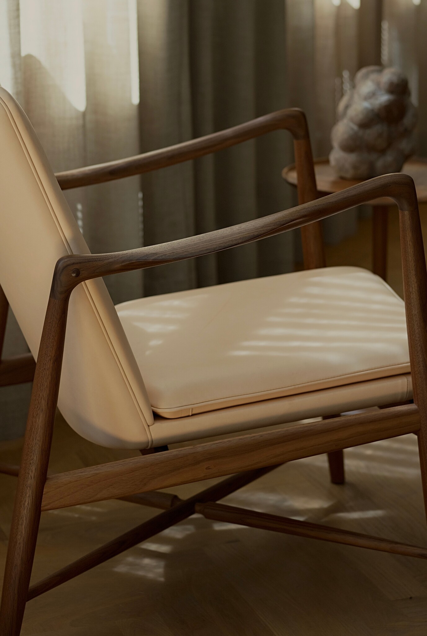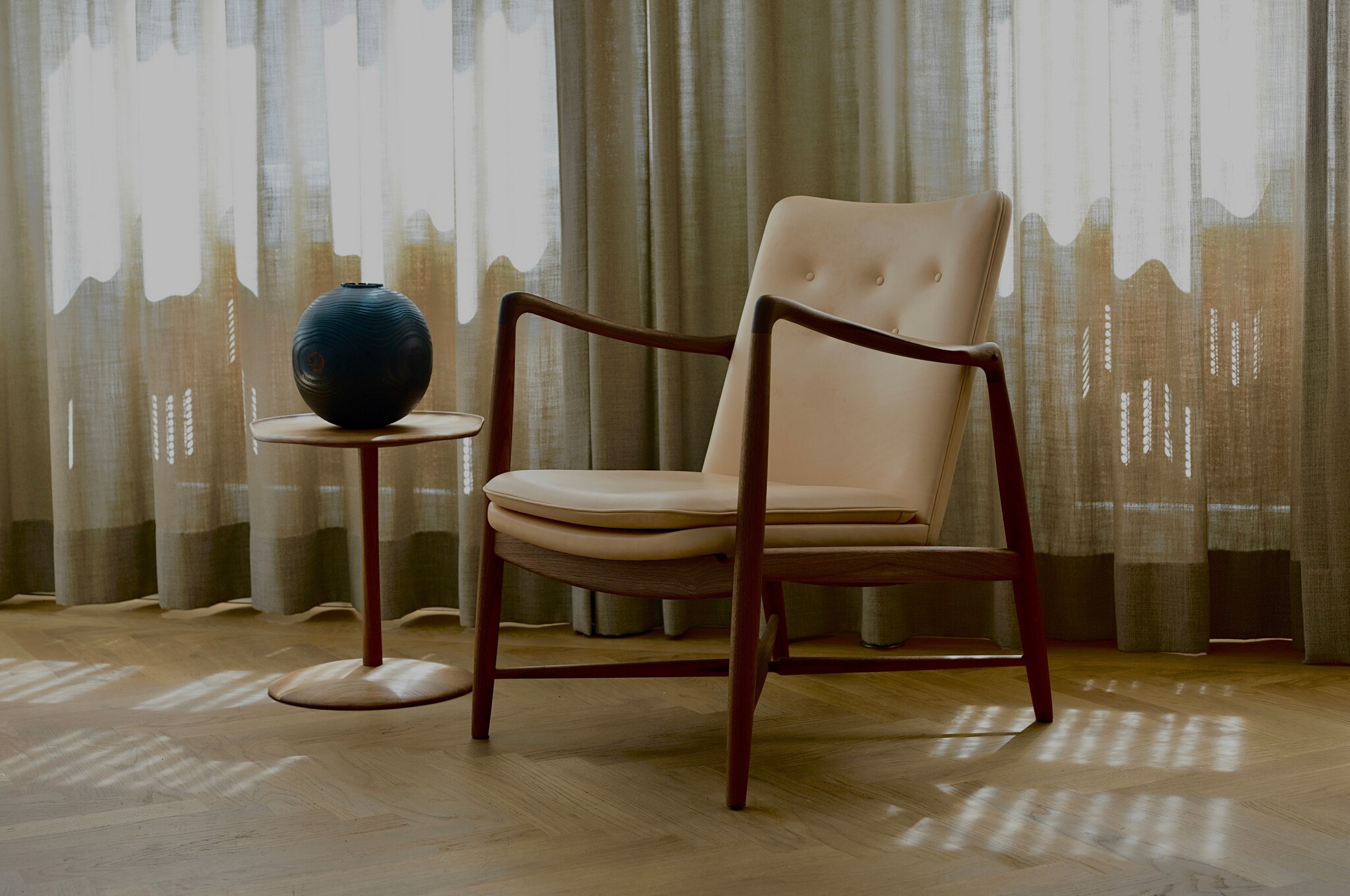 House of Finn Juhl is delighted to announce the relaunch of the Fireplace Chair, a timeless design originally conceived by Finn Juhl in 1946. Despite being out of production for six decades, the chair's distinctive design has been kept alive through the efforts of auction houses and media across the globe, solidifying its status as a highly sought-after design classic. The chair's desirability on the vintage market is no coincidence. With sensual details such as the paper-knife armrest and its lavish, informal comfort, the Fireplace Chair is a true Finn Juhl classic.