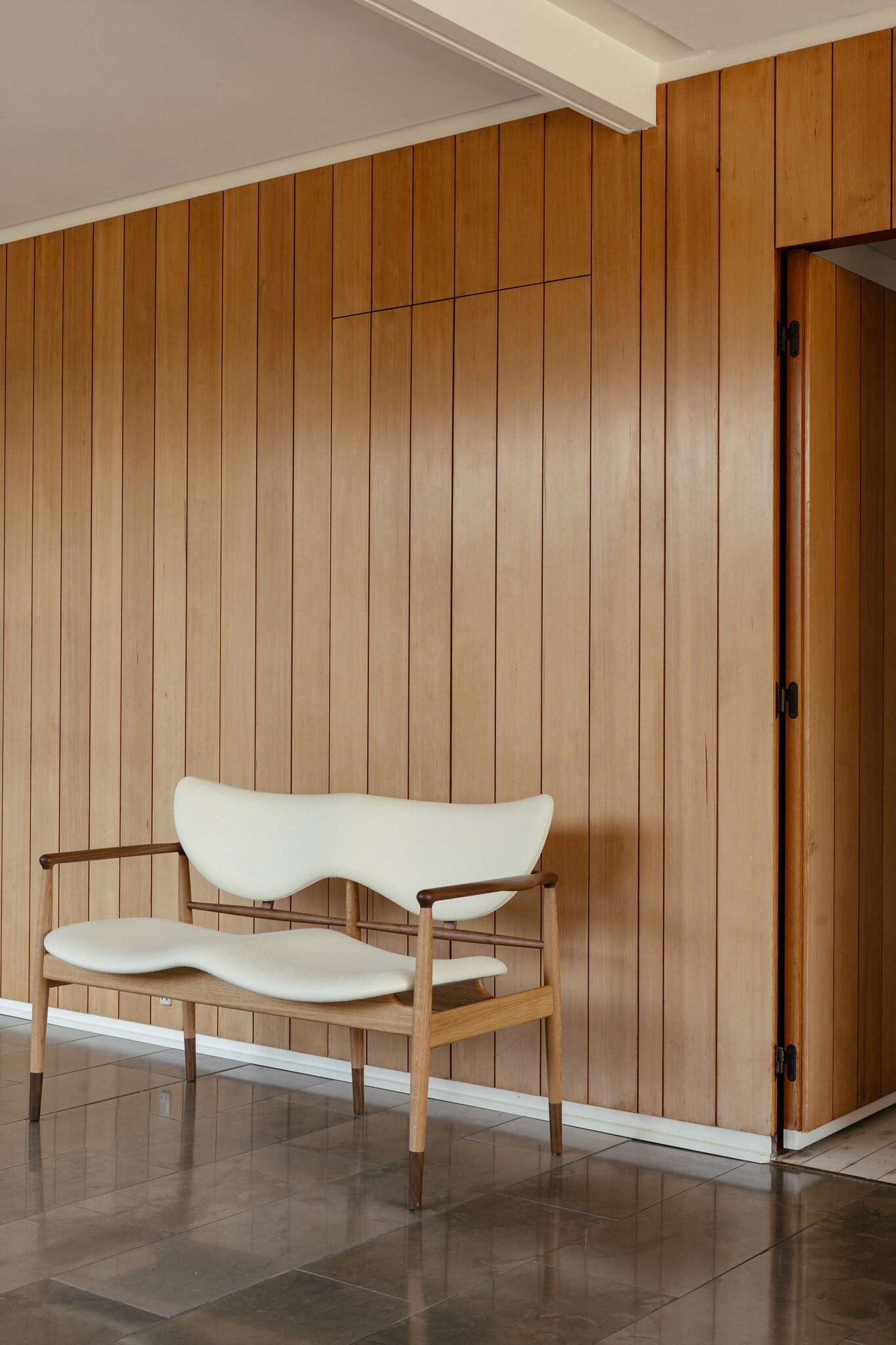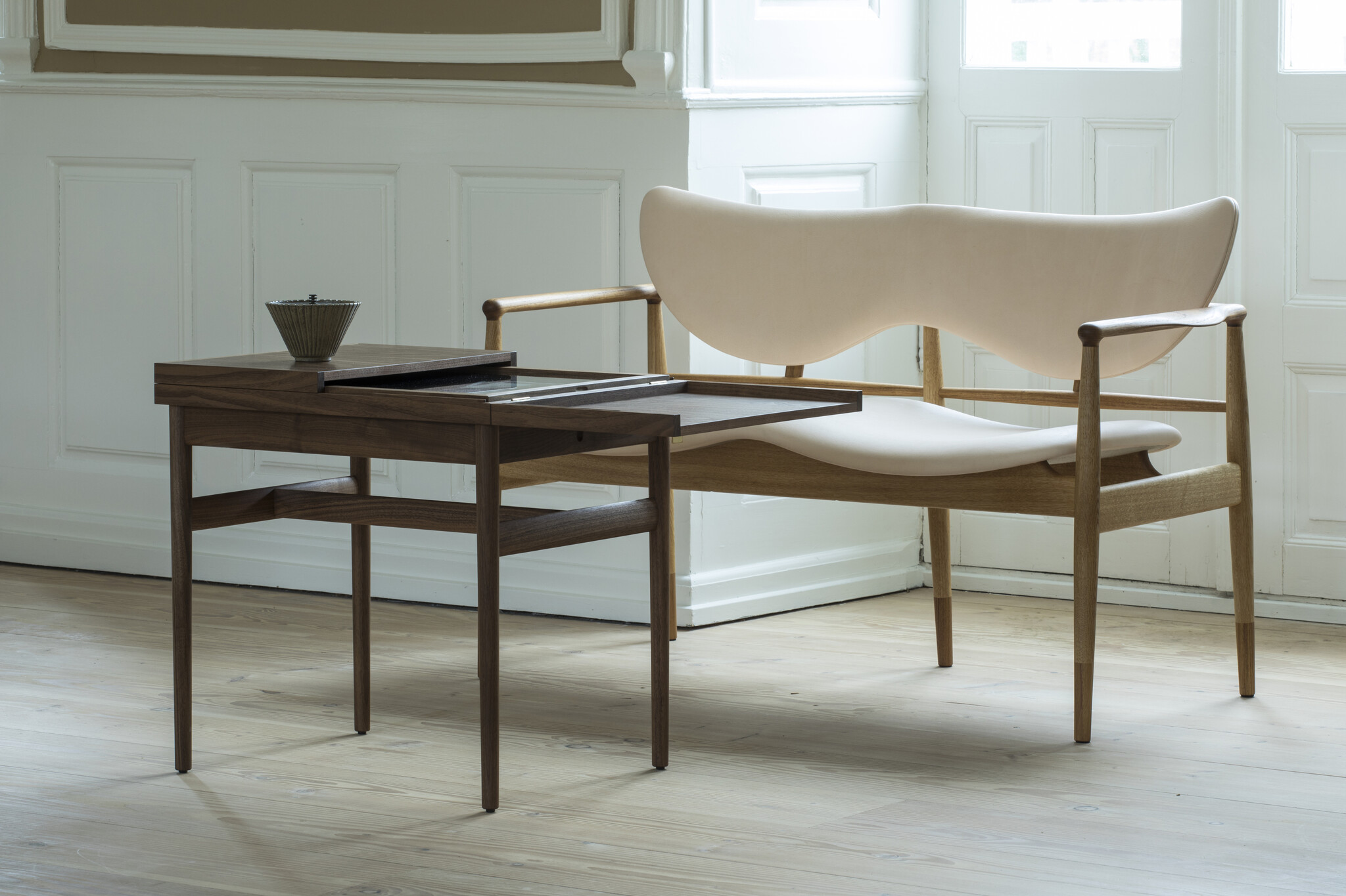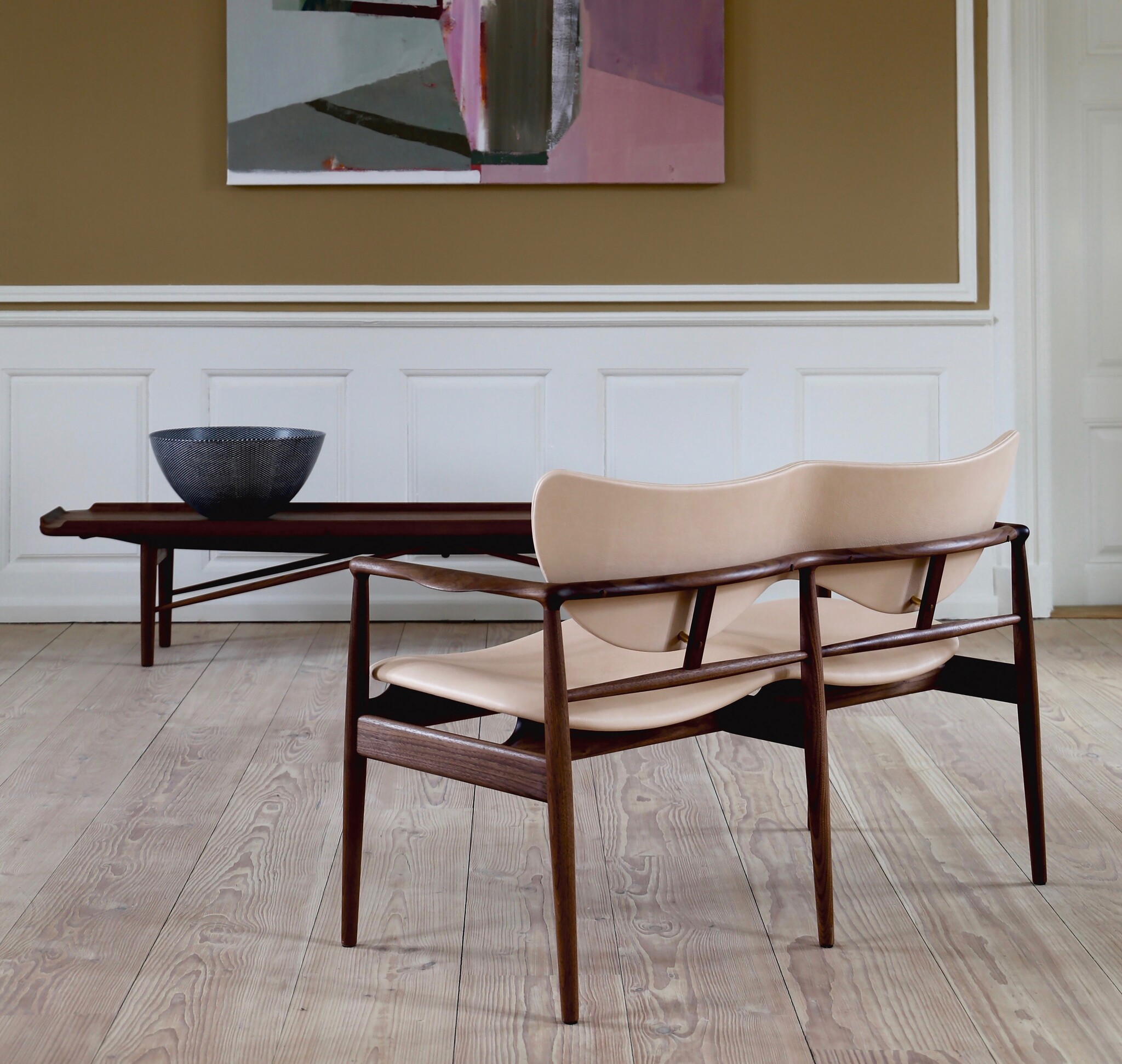 Additionally, the 48 Series is characterized by the use of multiple materials. Today, it is rare to see furniture that employs two different types of wood. This type of contrast has been left almost entirely to Finn Juhl despite the many years that have passed. The 48 Sofa-Bench is available in oak with armrests and toes in walnut and a version entirely in walnut. The Sofa-Bench is upholstered with either fabric or leather.