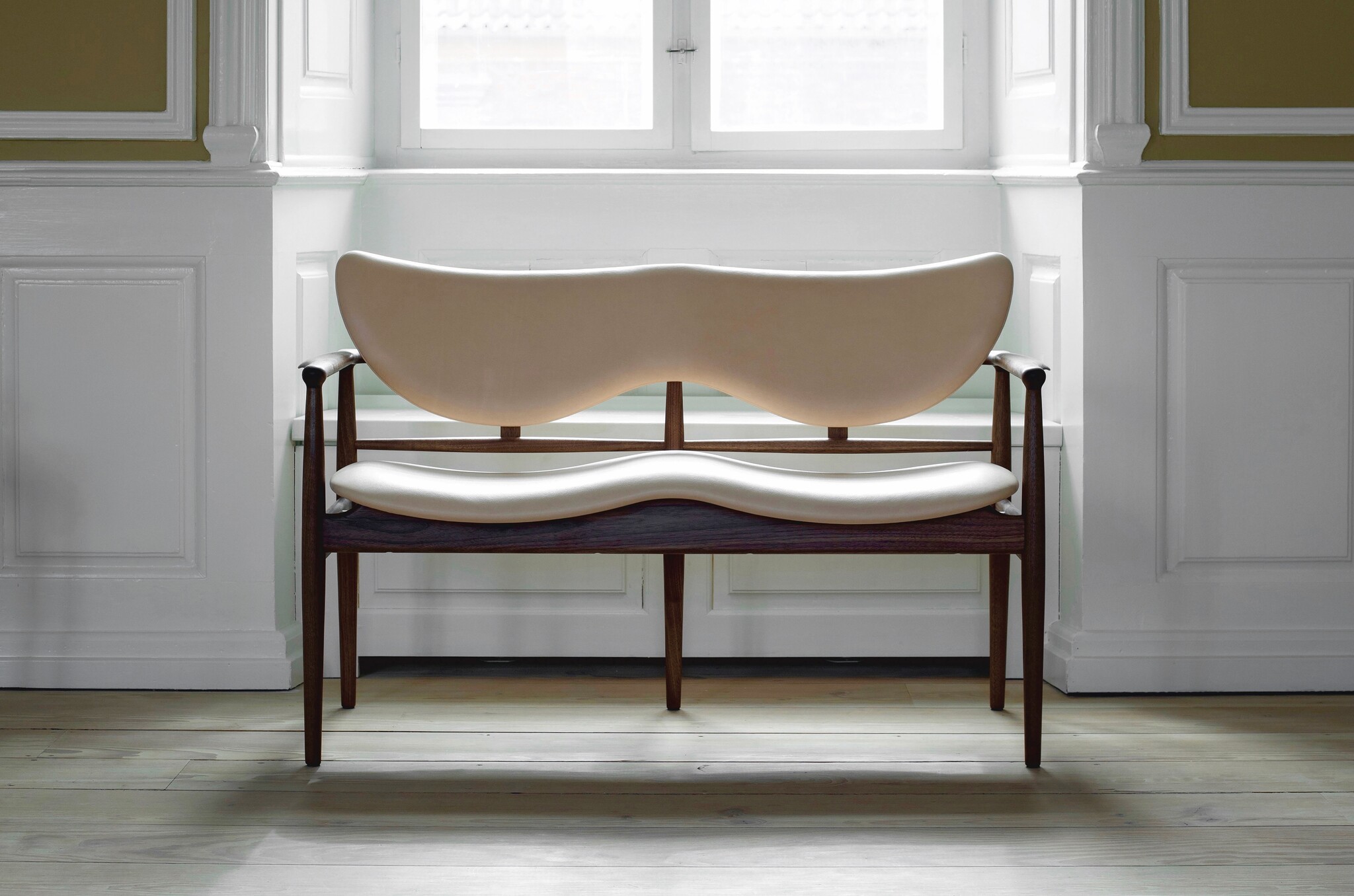 The 48 Sofa-Bench is easily recognizable because of Finn Juhl's characteristic and sculptural shapes and delicate details. The chair embraces the seated person while the rounded surfaces are shaped to fit the gravity of the resting body and its proportions. The organically shaped seat and backrest, upholstered in fabric or leather, are raised from the carrying frame in an almost demonstrative manner. Visually this lifts the seated person, making it appear as if the law of gravity has been defeated.