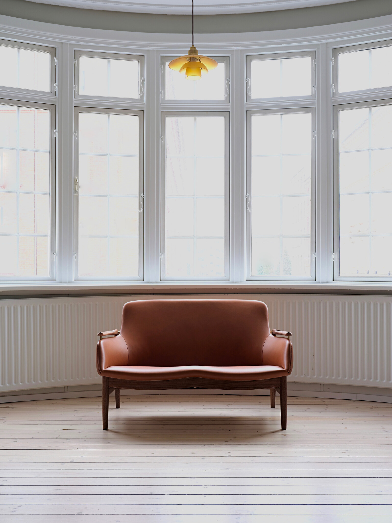Finn Juhl's characteristic design feature of separating the carrying elements from the carried is also at play in the FJ 53. However, this time the separation is achieved via more sophisticated means to add-in the aforementioned lightness and elegance. The rear legs, completely free from upholstery, protrude from the floor. In a single, unbroken motion they change direction and expand into an organically shaped armrest, almost animalistic in nature. The armrest wraps around the upholstery as if it is levitating, to arrive in a smooth and upwards point, begging to be touched.