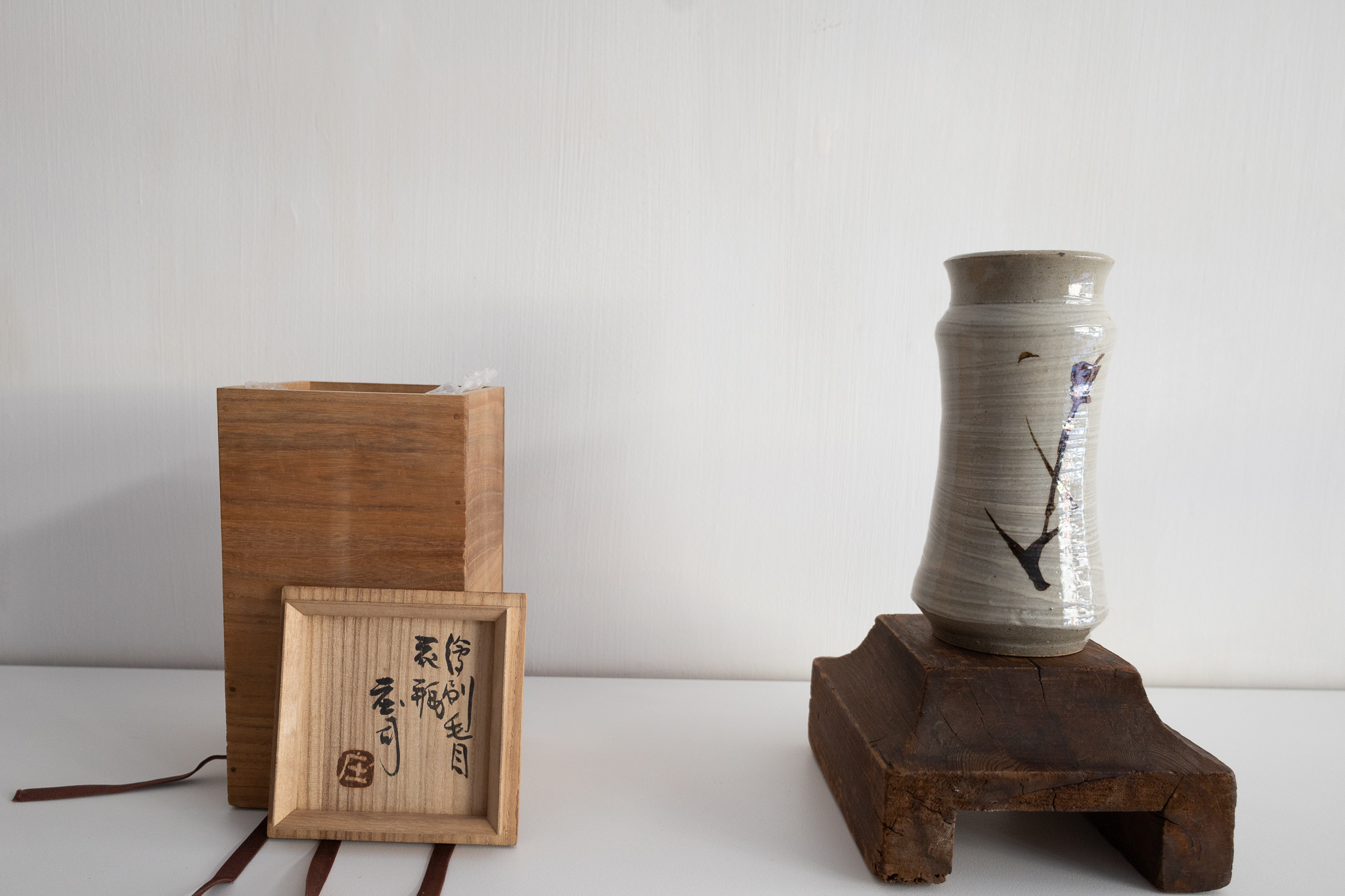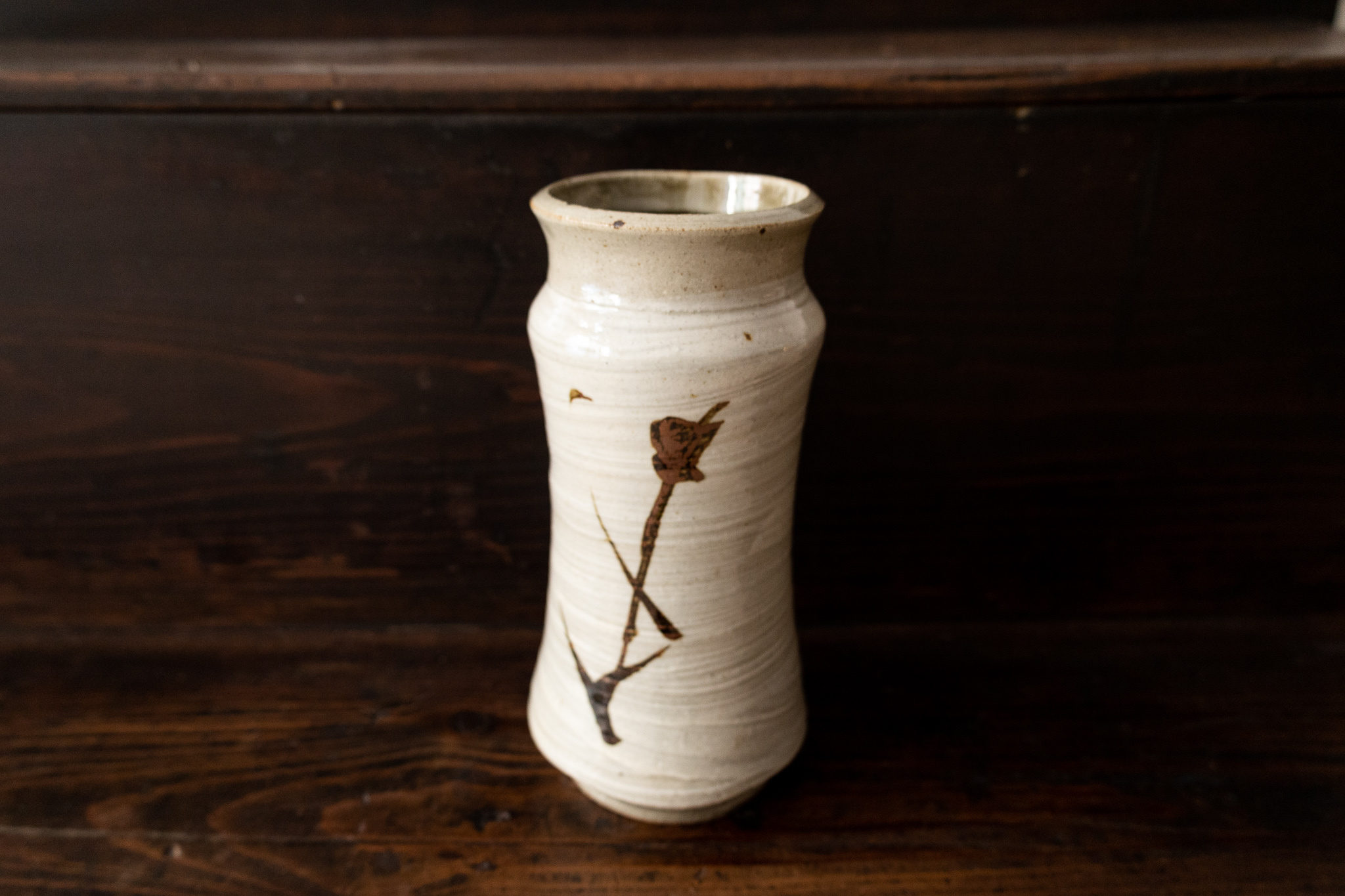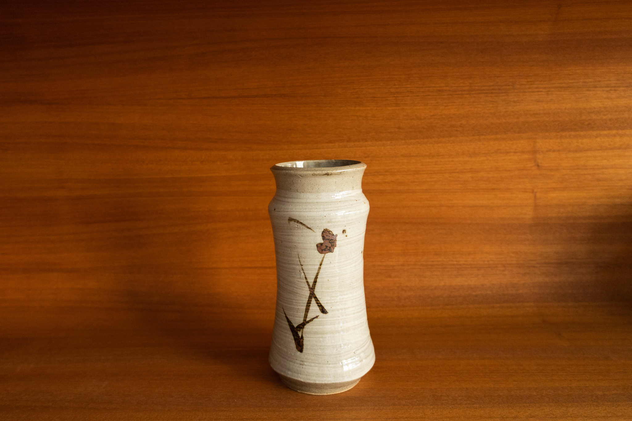 This is a special vase by one of Japan's most important ceramic artists: Shoji Hamada. The soft white glaze and oxidized iron brush stroke depicting a branch is an iconic gesture by Shoji Hamada.