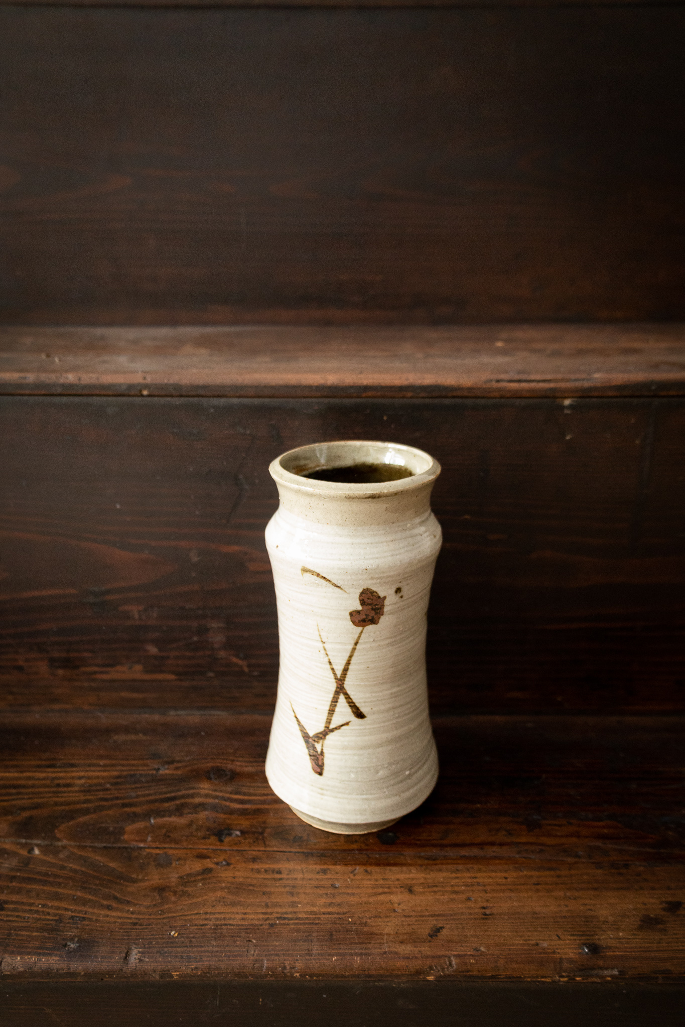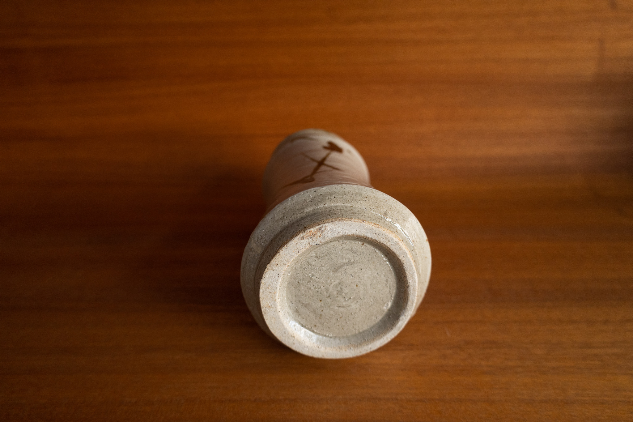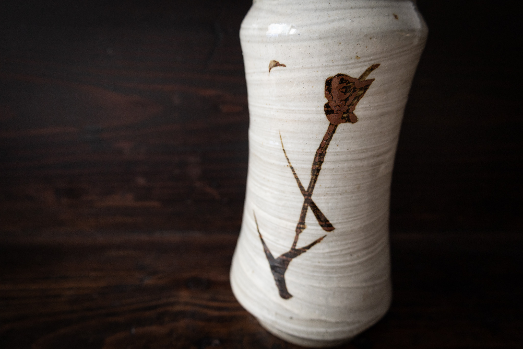 This is a special vase by one of Japan's most important ceramic artists: Shoji Hamada. The soft white glaze and oxidized iron brush stroke depicting a branch is an iconic gesture by Shoji Hamada.