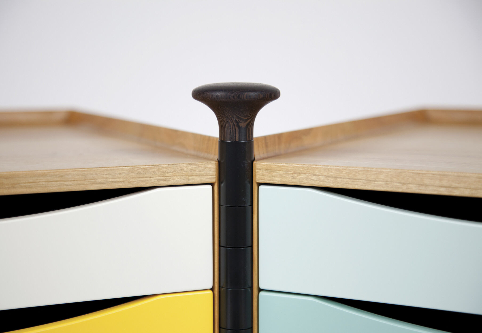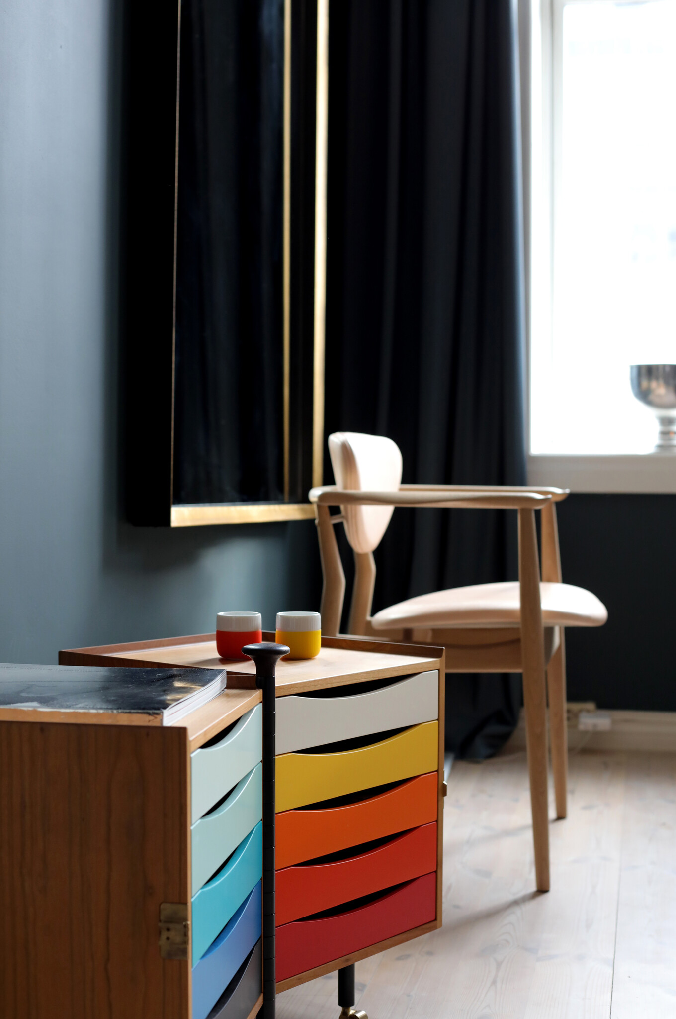 The delicate cabinet opens up like a jewellery box and reveals its ten trays in different colours, based on Goethe’s theory on colour and his colour wheel. Hanne Wilhelm Hansen loved gloves, but found it difficult to keep track of all the pairs, and the colour-coded trays were designed to help her keep order among the untidy gloves.