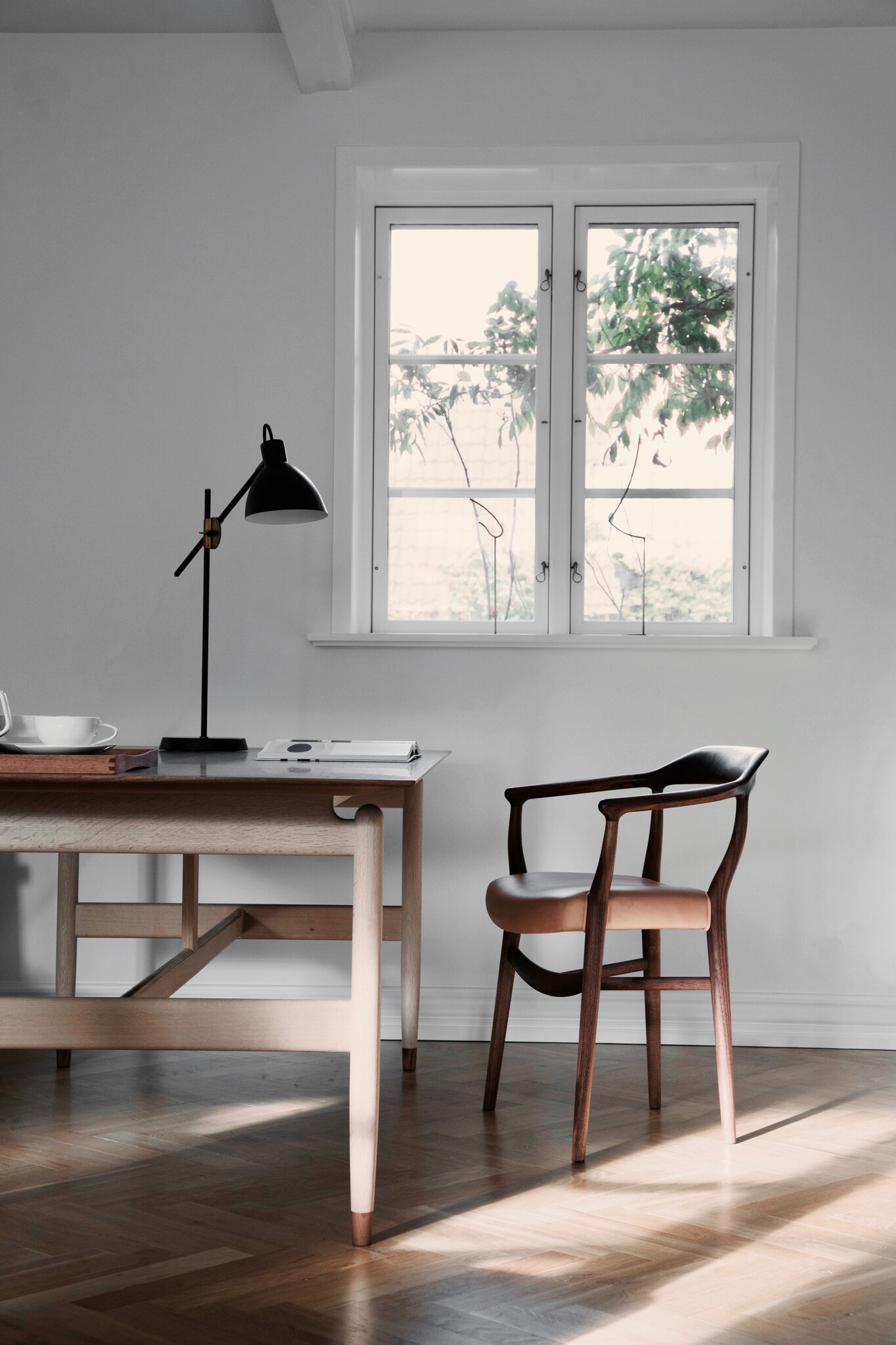 Finn Juhl deliberately worked with a mix of wooden materials. A dark tabletop in walnut and a lighter frame in oak very clearly separates the carried and the carrying elements. The table’s many design details have both a practical and a visual function.