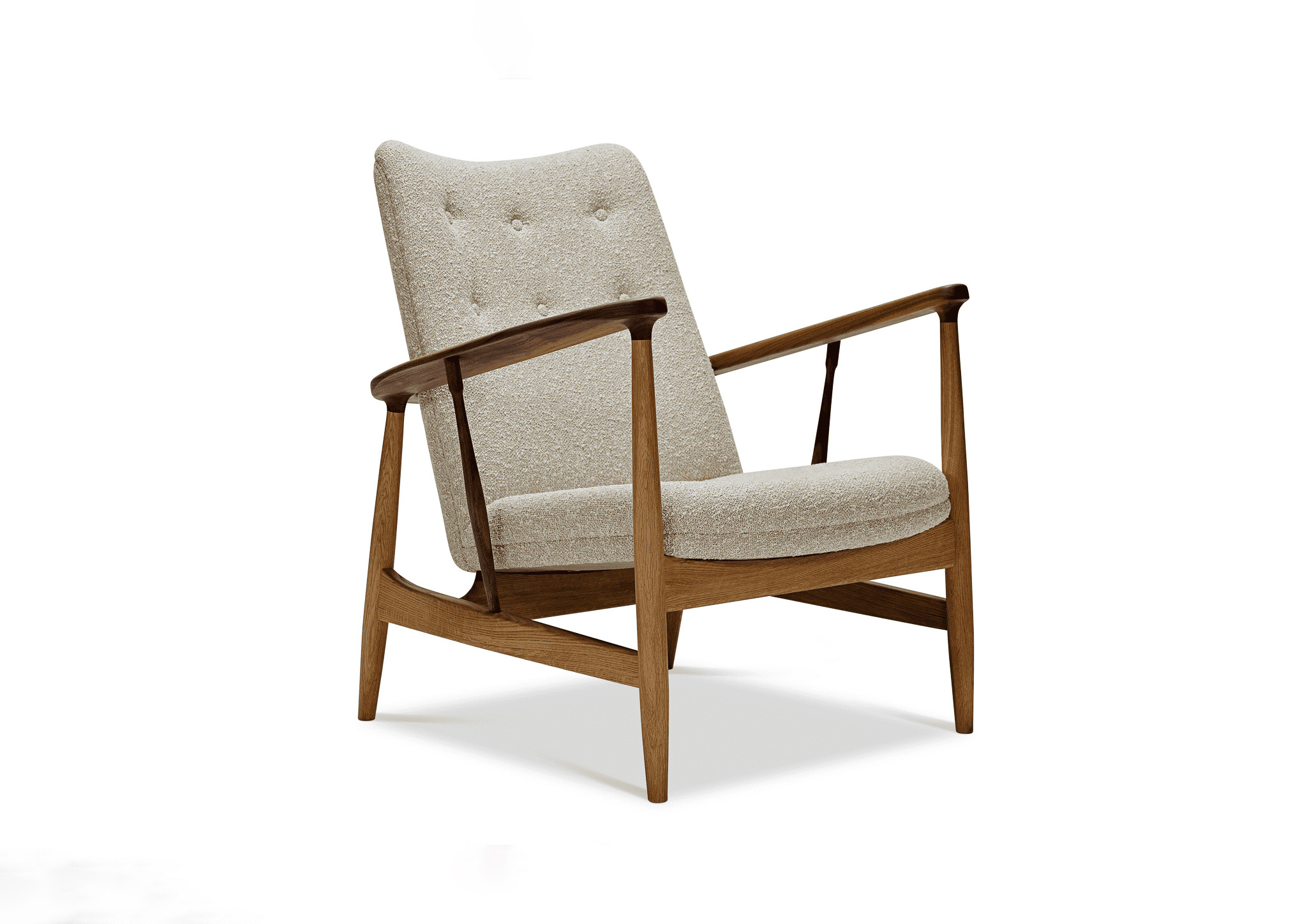 The comfortable and distinctive chair with the broad, embracing armrest is know in the vintage marked as SW 86, named after its original manufacturer, Søren Willadsen Møbelfabrik in Vejen, Denmark. However, driven by international aspirations, Finn Juhl also sent the drawing of the chair to the American furniture manufacturer Baker Furniture, which in the early 1950s launched and relaunched several of Finn Juhl's designs. The new name ‘Kettelhut’ honours Mary Ellen Kettelhut, the former Vice President of Marketing at Baker Furniture and the current owner of the original watercolour drawing of the chair. The chair's frame consists of a combination of solid oak and walnut and is available upholstered in leather or textile.