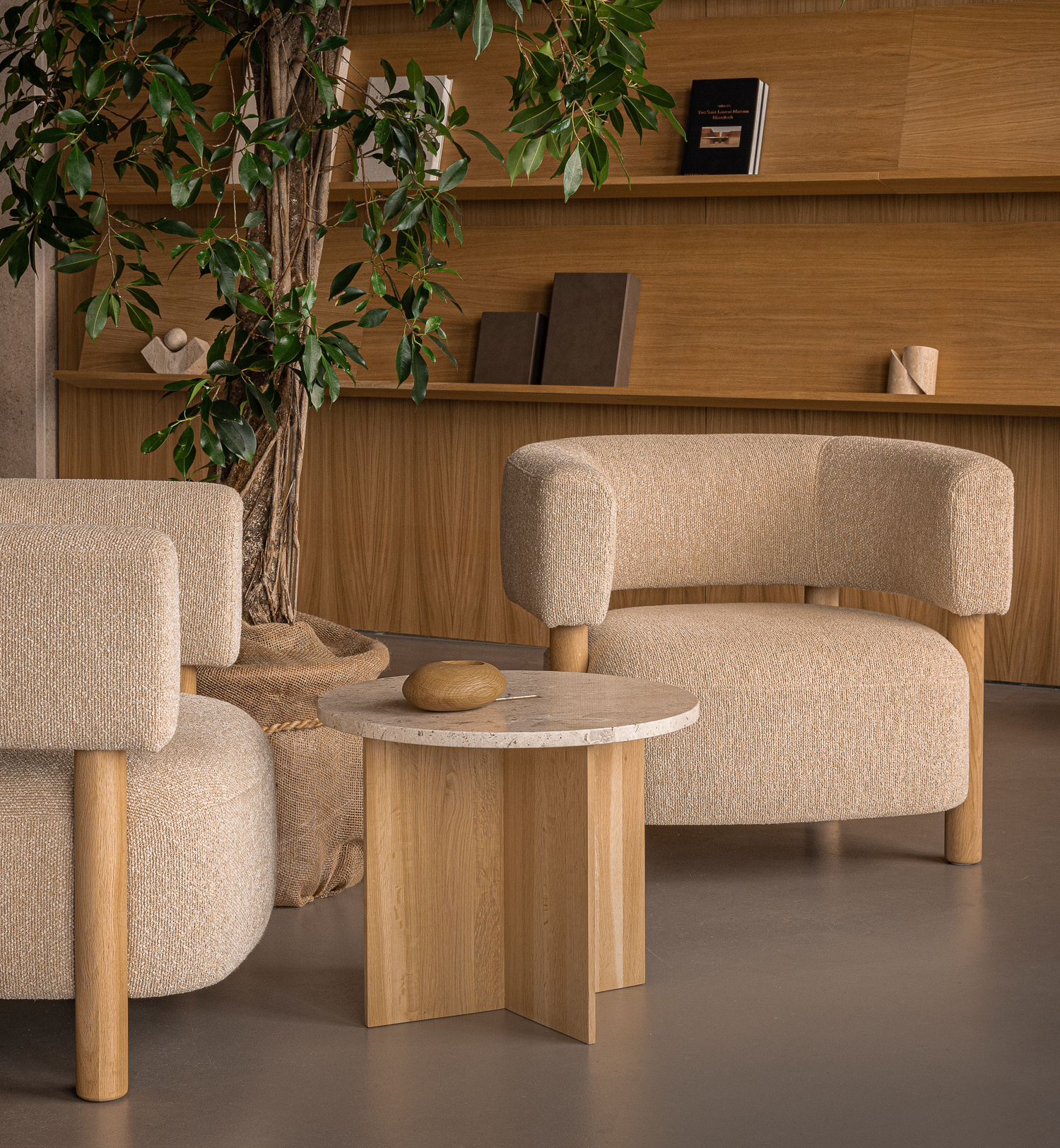 Colour & Materiality Frame: White oak or smoked oak, Table Top: Marble