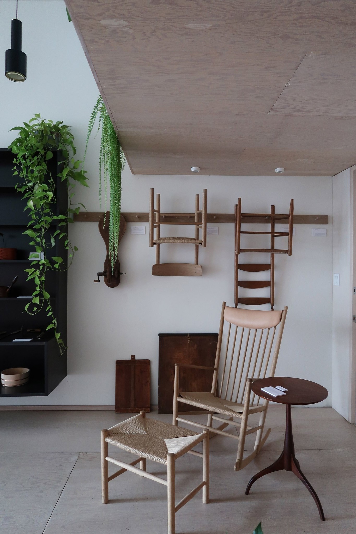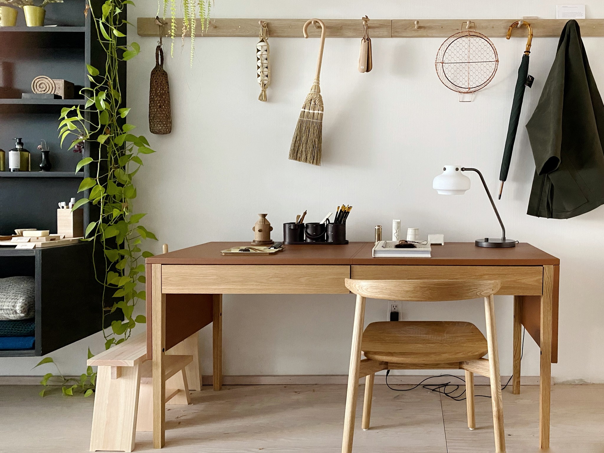 A Shaker-inspired peg rail made locally in Toronto using white oak and brass hardware.