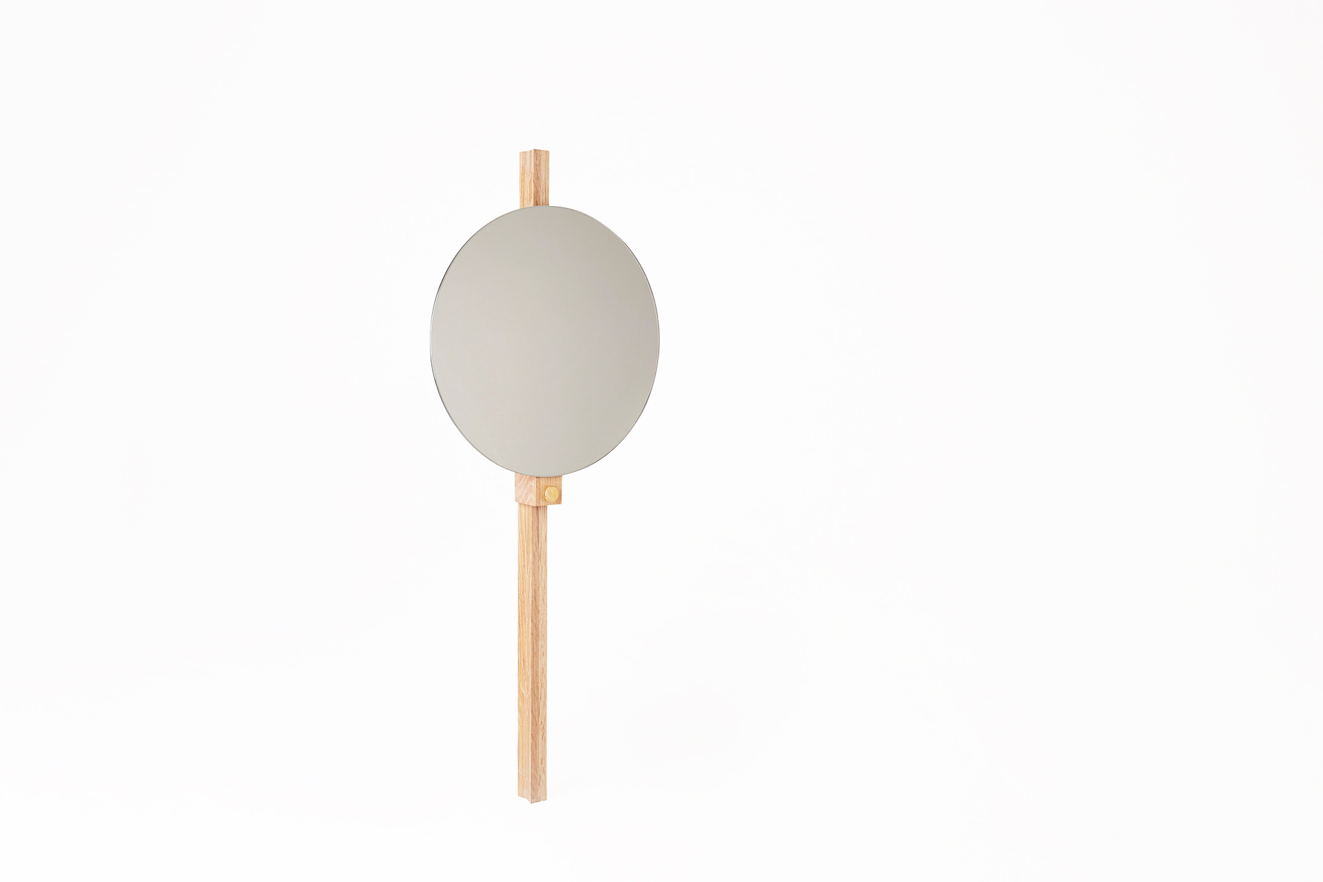 The rail is simply hung on the wall with one screw and is intended for the modern home where the shaker peg-rail is no longer common. The dove-tail shaped rail allows for vertical adjustment of the mirror or shelves through the turn of a brass knob, giving the product a flexible nature.