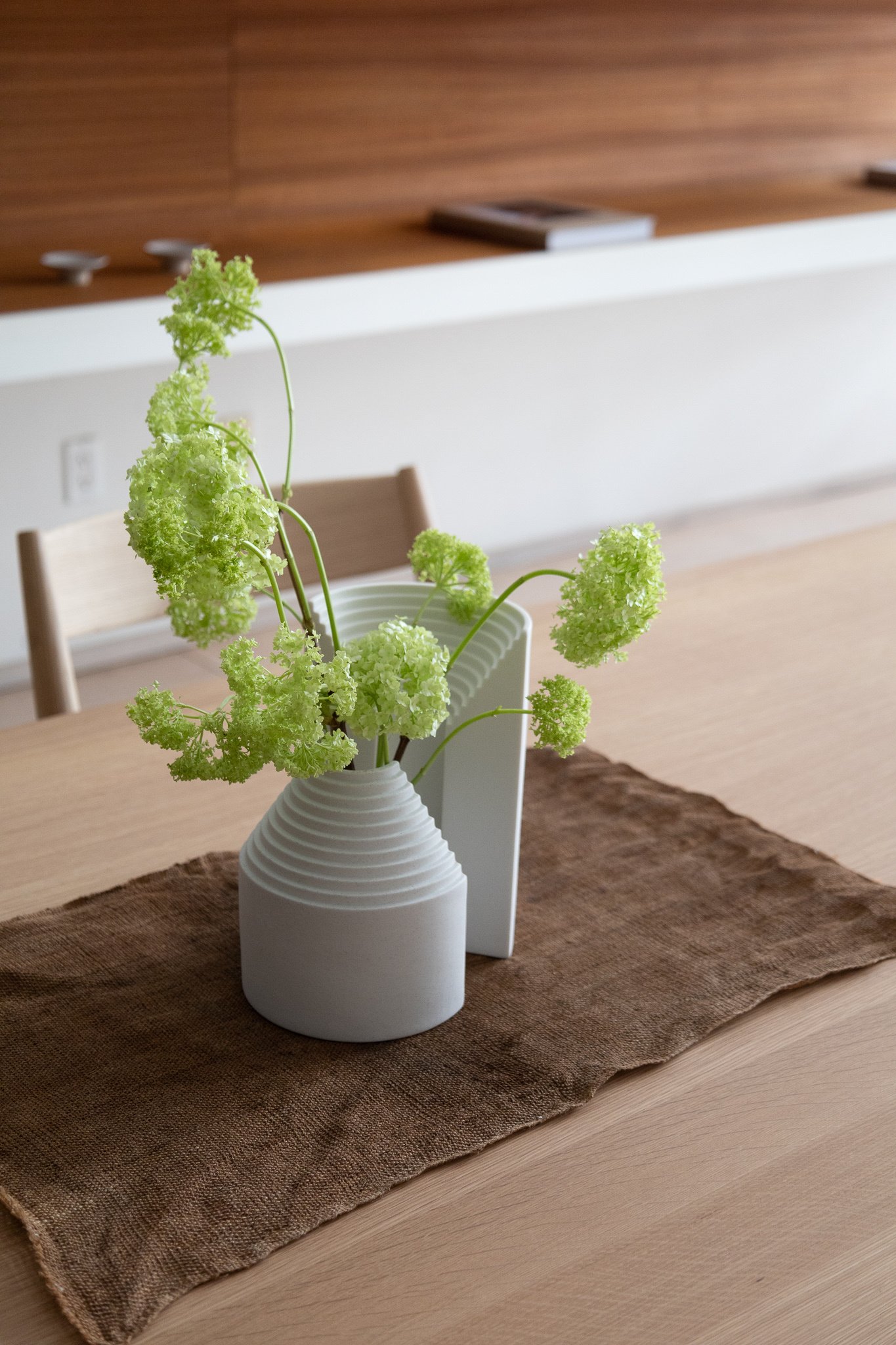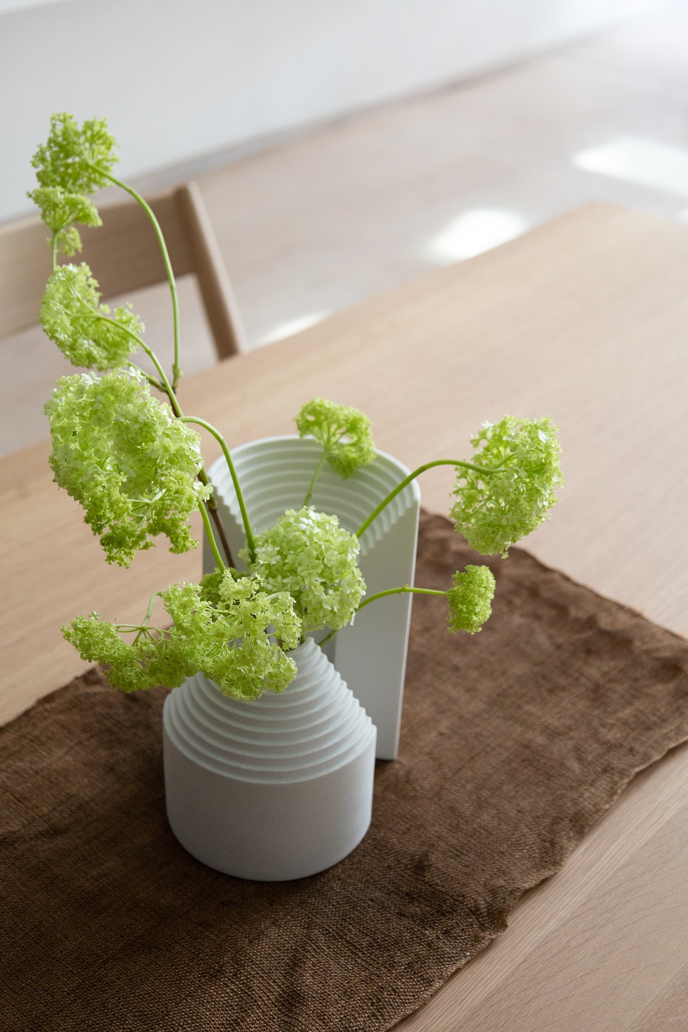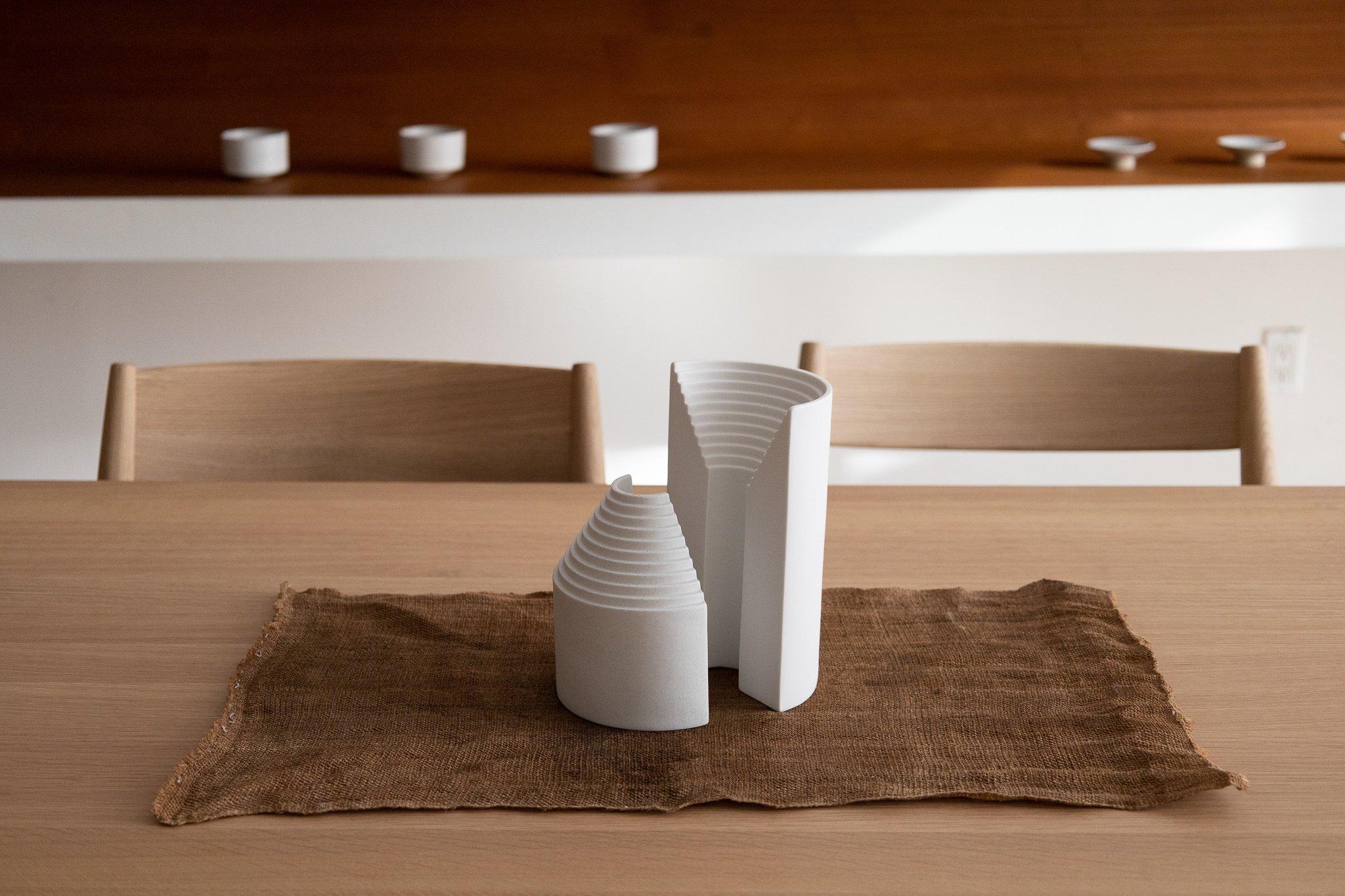 The Ark vase is a result of the fascination for architectural elements - staircases, archways, the rhythm and repetitive aspect of classical architecture. It represents the beauty of architectural details as individual archetypes, while still maintaining a functional purpose as a vase. Combining the raw materiality of thick-walled porcelain with a crystal glass insert, the vase has a sculptural identity and can be displayed in various ways, on its own or in combination with another.
