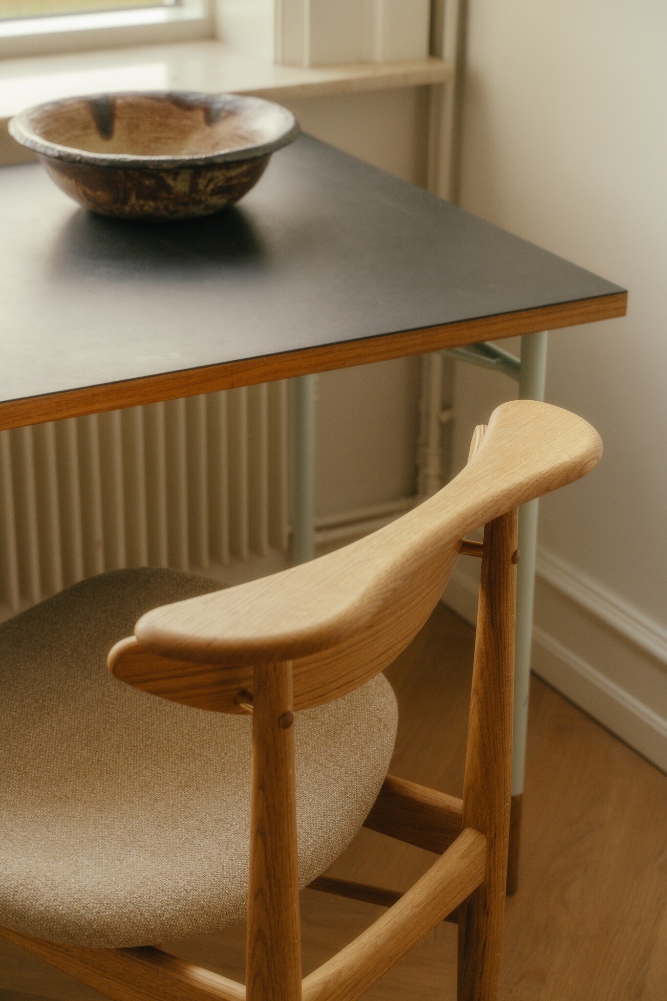 When Finn Juhl established his first studio at the exclusive address of 33 Nyhavn in central Copenhagen in 1945, he designed a very simple desk with burnished steel legs, a detail which came to shape his furniture design during the 1950s. When Finn Juhl moved his studio to 38 Sølvgade in 1957, these same tables were still used.
