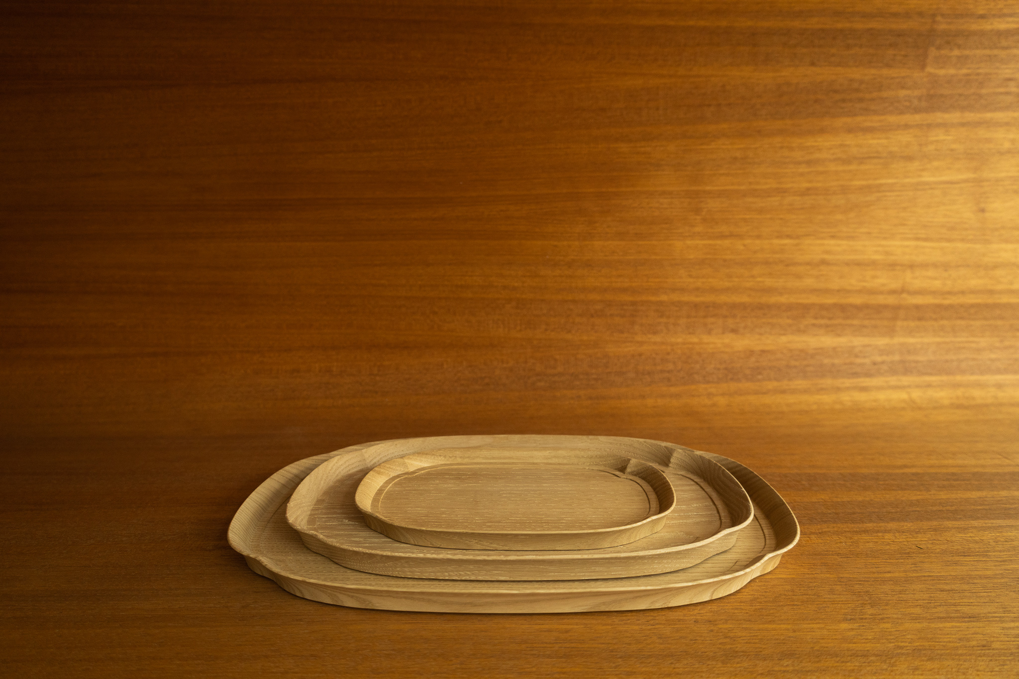 3 sizes of wooden (Zelkova) trays with the Japanese traditional motif of flowering quince finished with non-toxic liquid-glass coating. This product series is named “KITO,” meaning “with Tree” in Japanese, so that we can spend our daily life in touch with the essence of the wood. We believe that the feel of comfort that only solid wood can bring is essential for us to spend a peaceful life. Striving to create products which deliver the comfort, hoping that people can be respectful and appreciative to the nature.