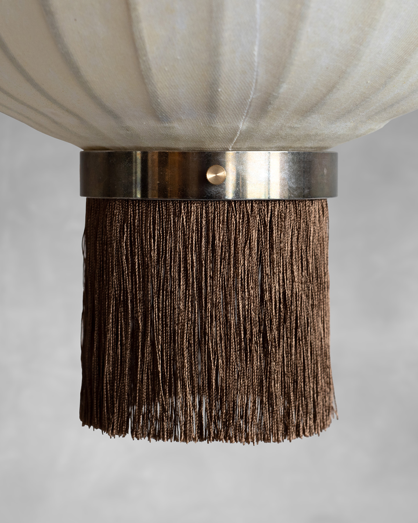 Material Walnut & bamboo frame, Hand-colored TC fabric, Metal pipes & ring, Rayon fringe