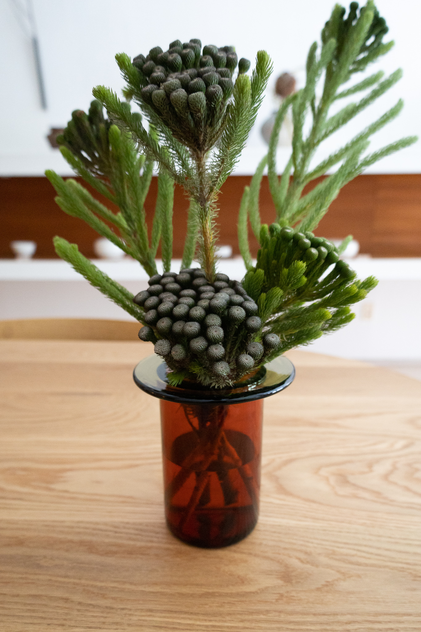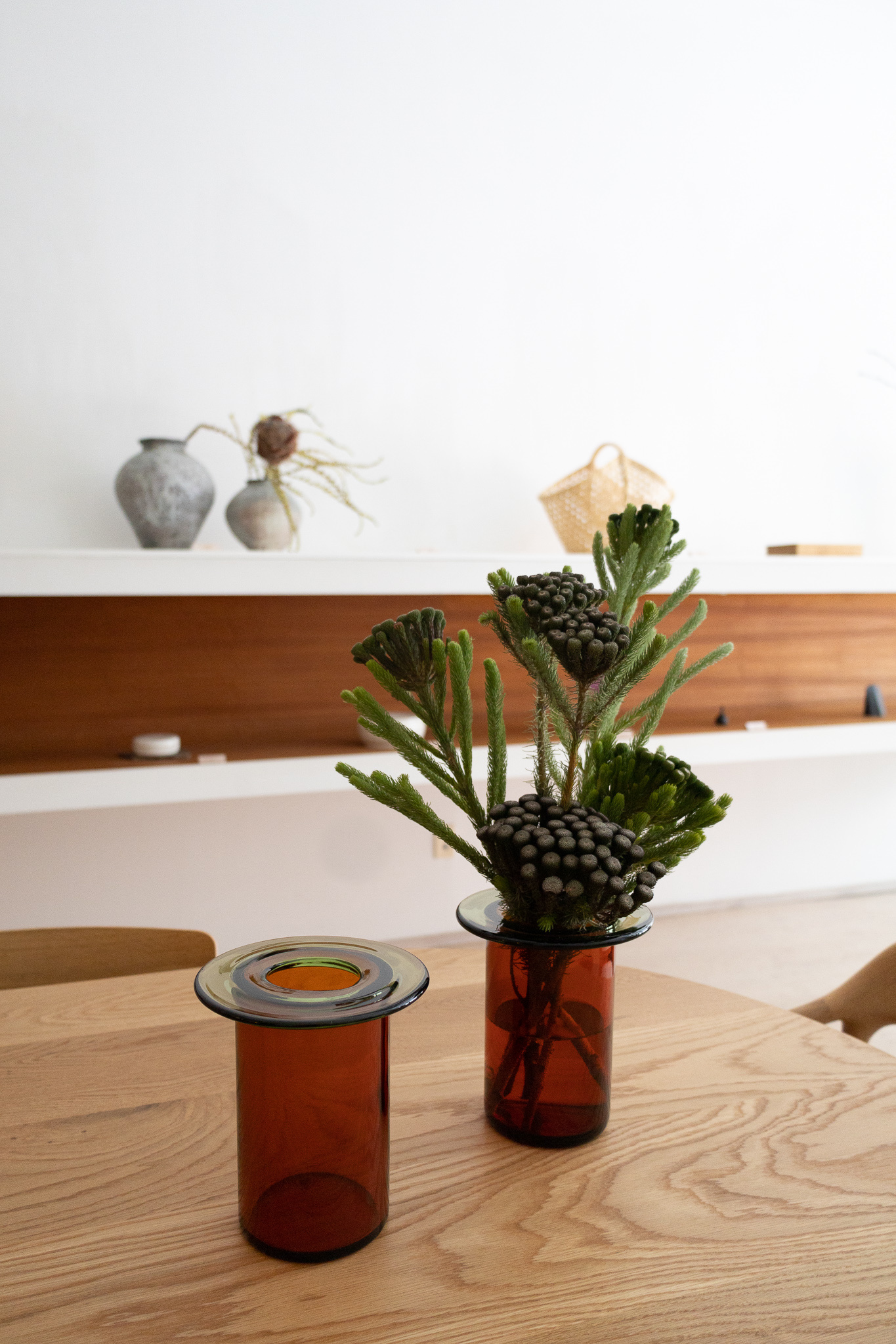 Like petals on a stem The vase has a lot of different connotations. We appreciate how the strict and defined architectural grammar of the object resonates well with the more expressive and animated objects of our collection. But ‘Rabarbra’ also reminds us of something vegetal – a stylized flower with the top disc resting on the lower body like petals on a stem.