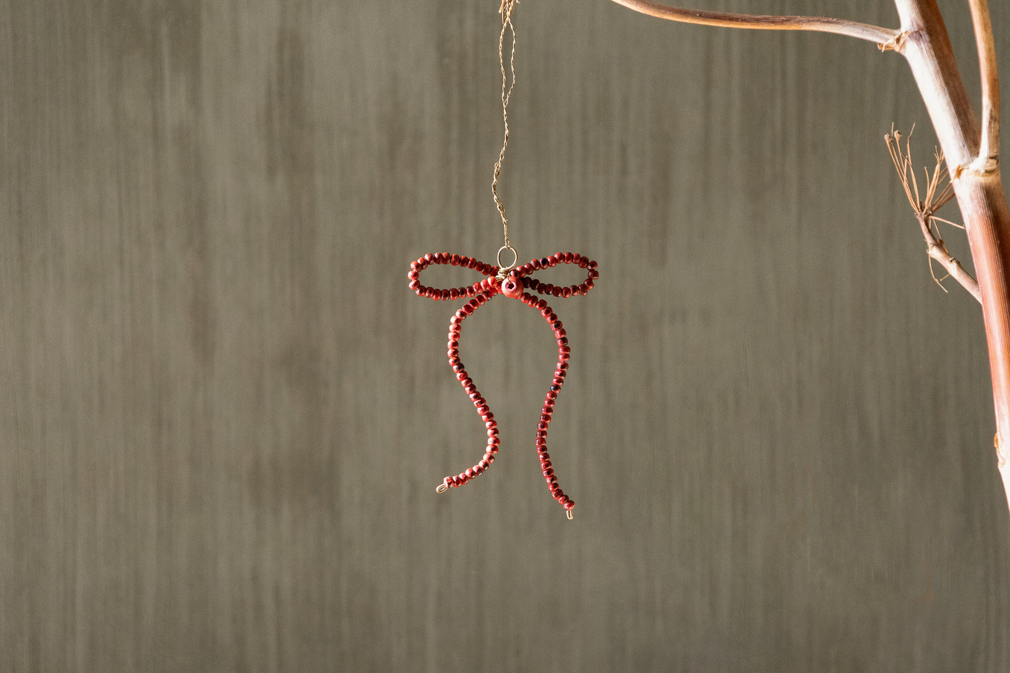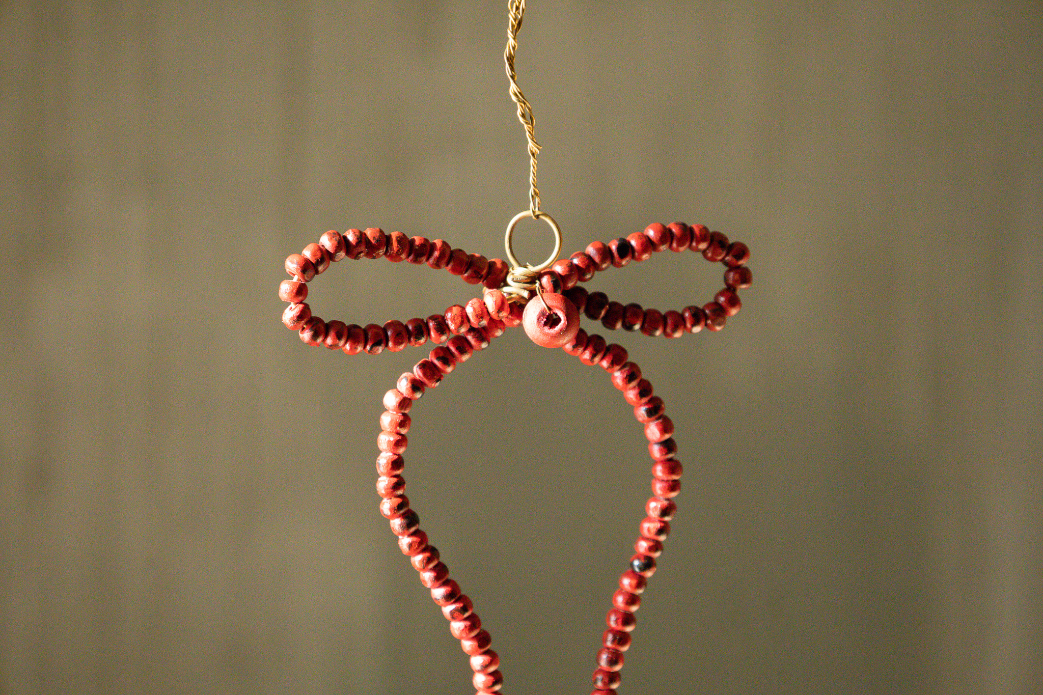 A delicate handwoven brass and red bead ribbon decoration. It can be hung as a large ornament on a Christmas tree but can also be a room decoration or hung in a window.