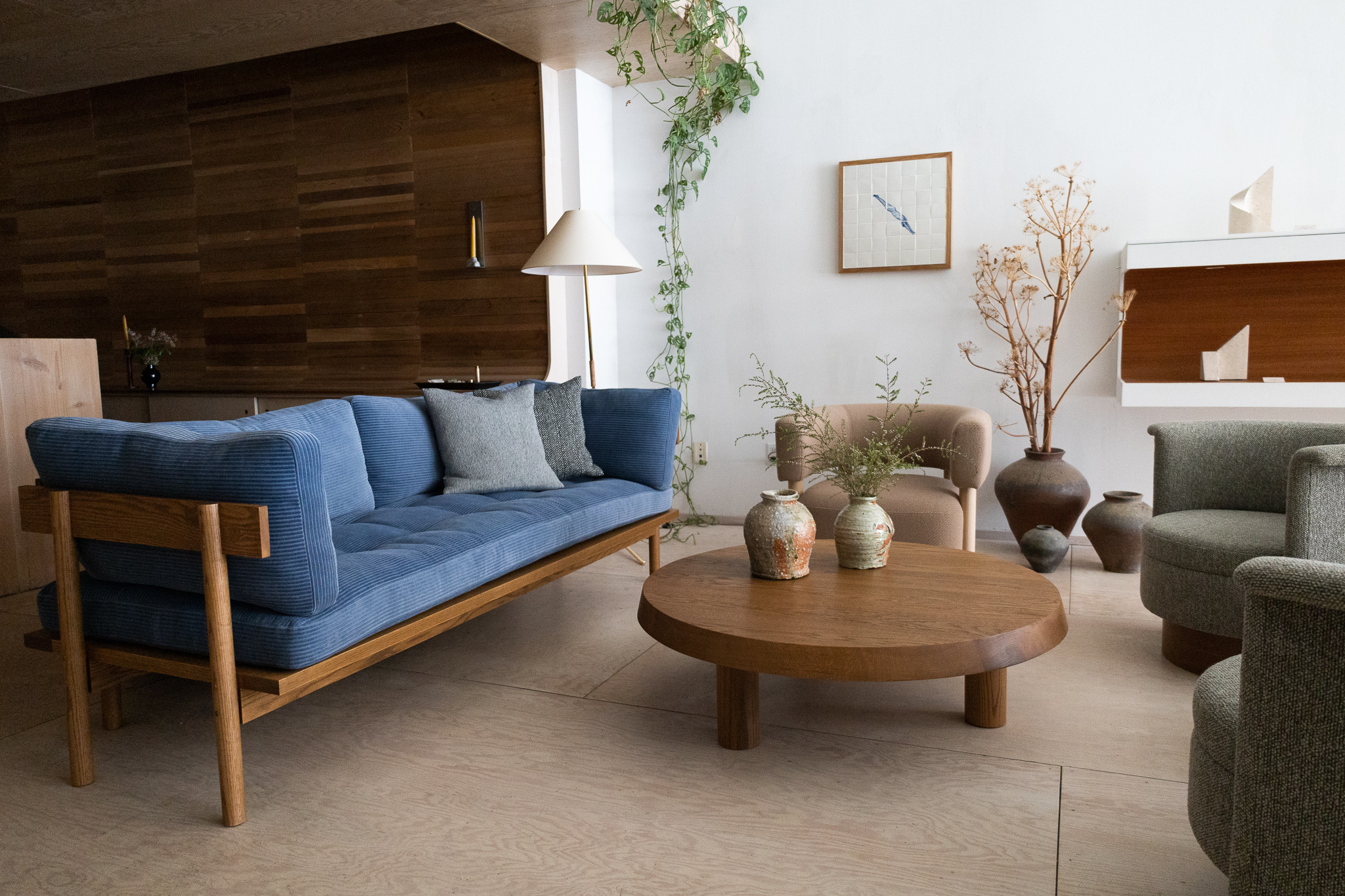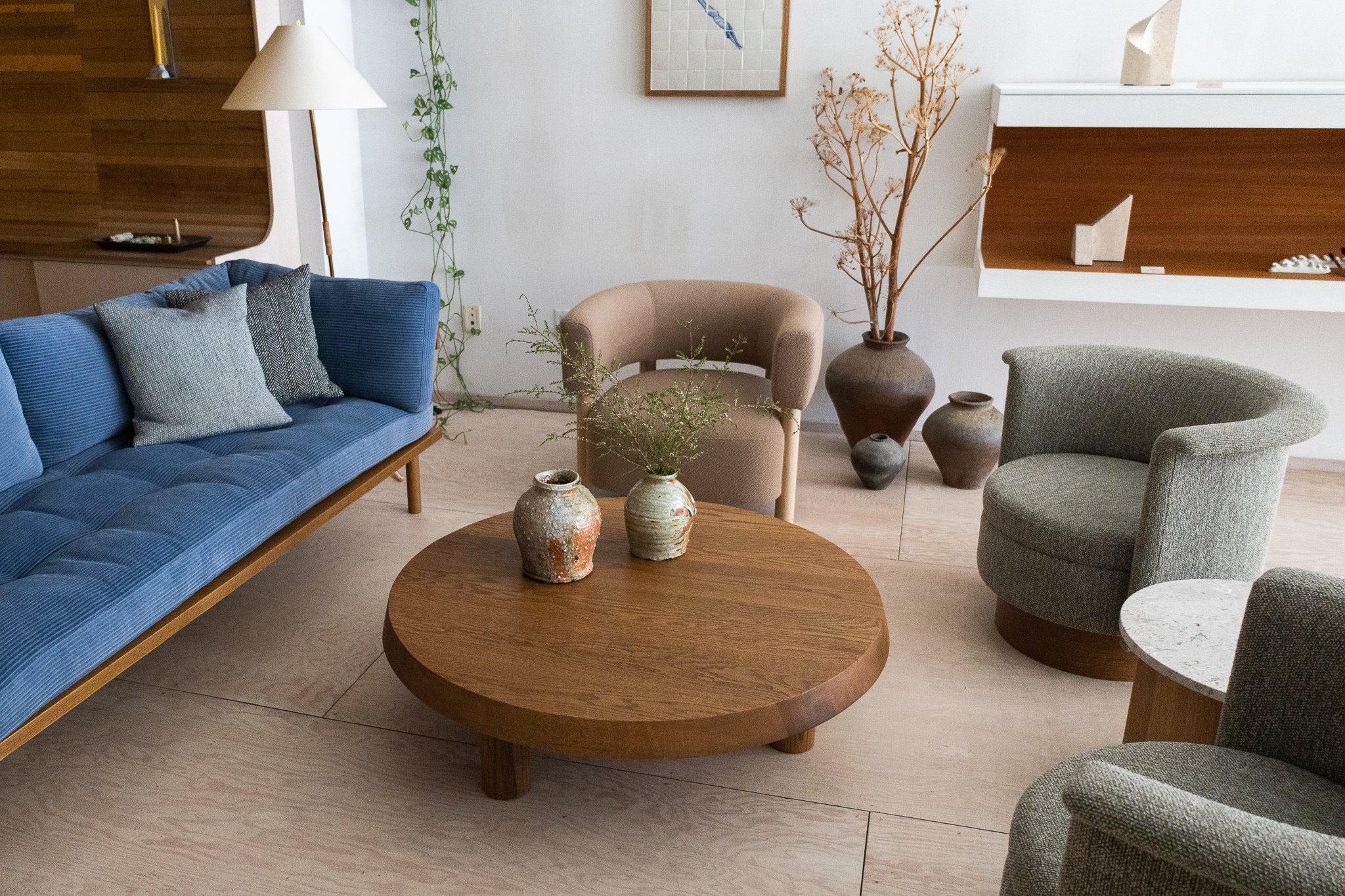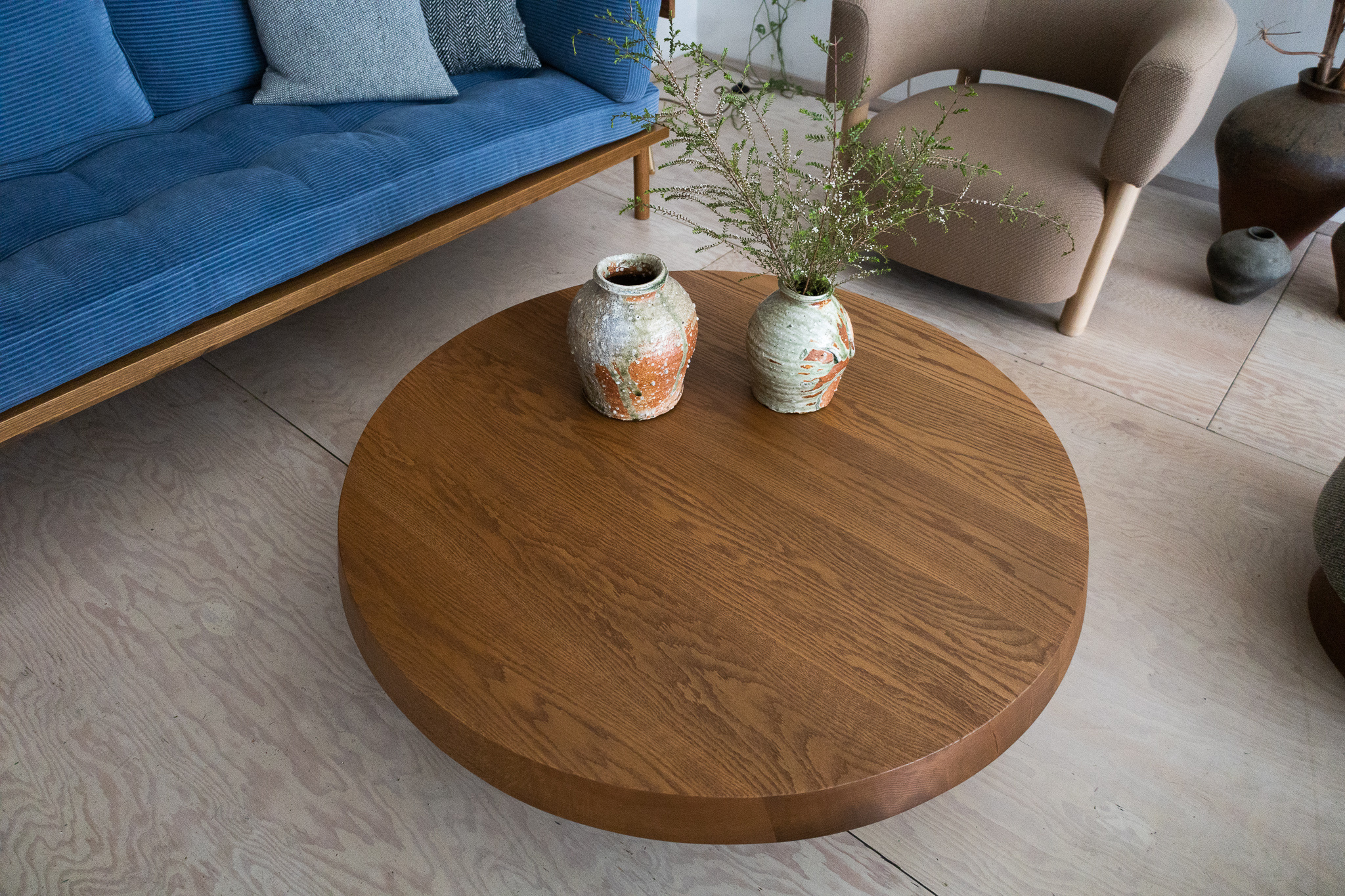 The Mjölk Round coffee table takes its inspiration from the French modernist movement. Its slab built solid oak construction is finished with a special smoke oiled finish giving the surface a warm and aged look reminiscent of elm wood.