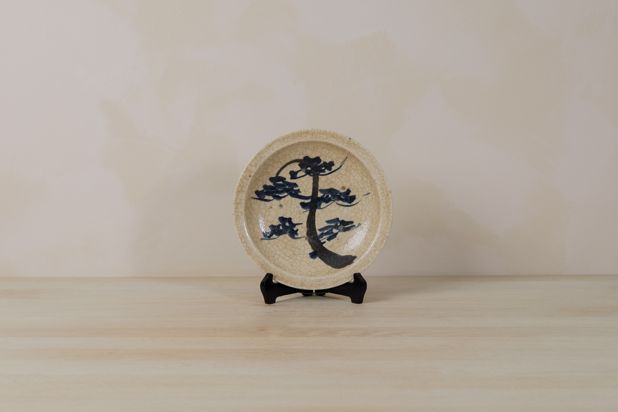 A particularly nice ceramic dish depicting a Pine tree painted in underglaze iron pigments on a crackled ground, the pine is a symbol for longevity and patience. There painted dishes were made at the Seto kilns in the late Edo period and used as serving plates in restaurants, inns and private homes along the Tokaido Road that linked Edo (present-day Tokyo) to Kyoto. They are the quintessential example of mingei (folk art) pottery.
