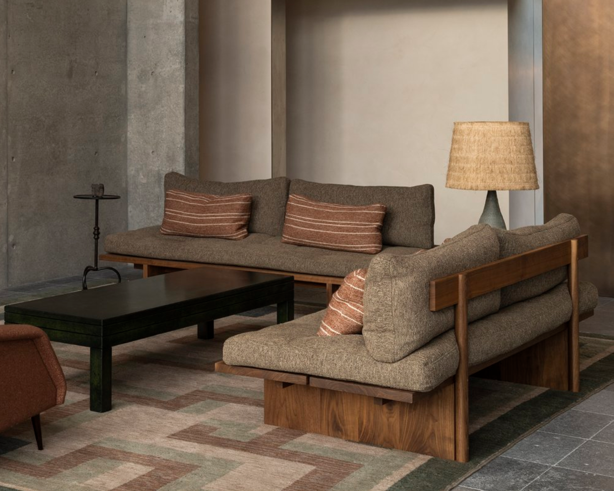 Thom Fougere's sofa is a continuation of our exclusive line of furniture, which began with the daybed in 2020. Archetypal in form, it is a study in reducing the sofa to its essentials: a composition of planes on which the upholstery appears to float. Its simplicity and bold clarity of construction emphasizes strong horizontal lines articulated with fine details. The seat and back are joined by two cylindrical posts which interface with the rectilinear planes in a thoughtful way. Generous cushions filled with duck feather appear to float on the wood frame.