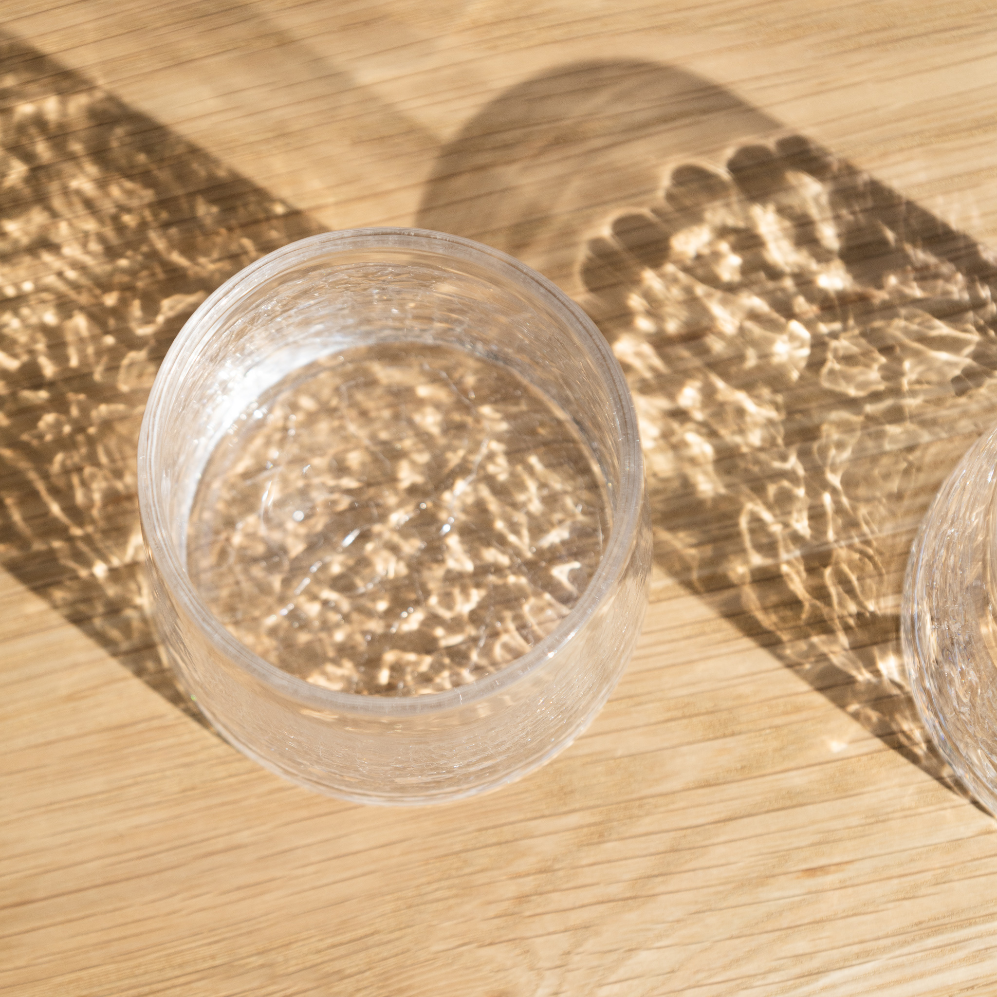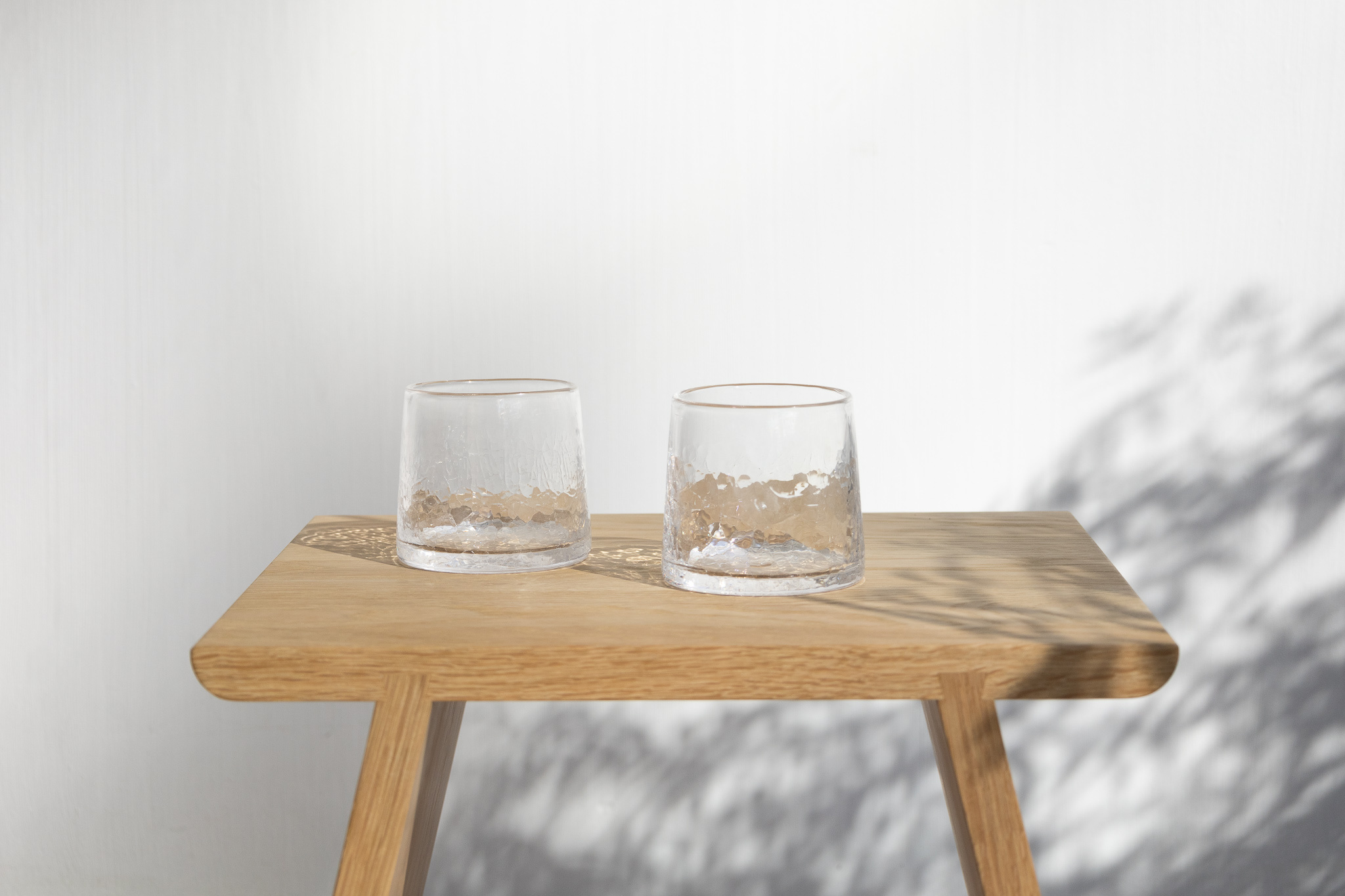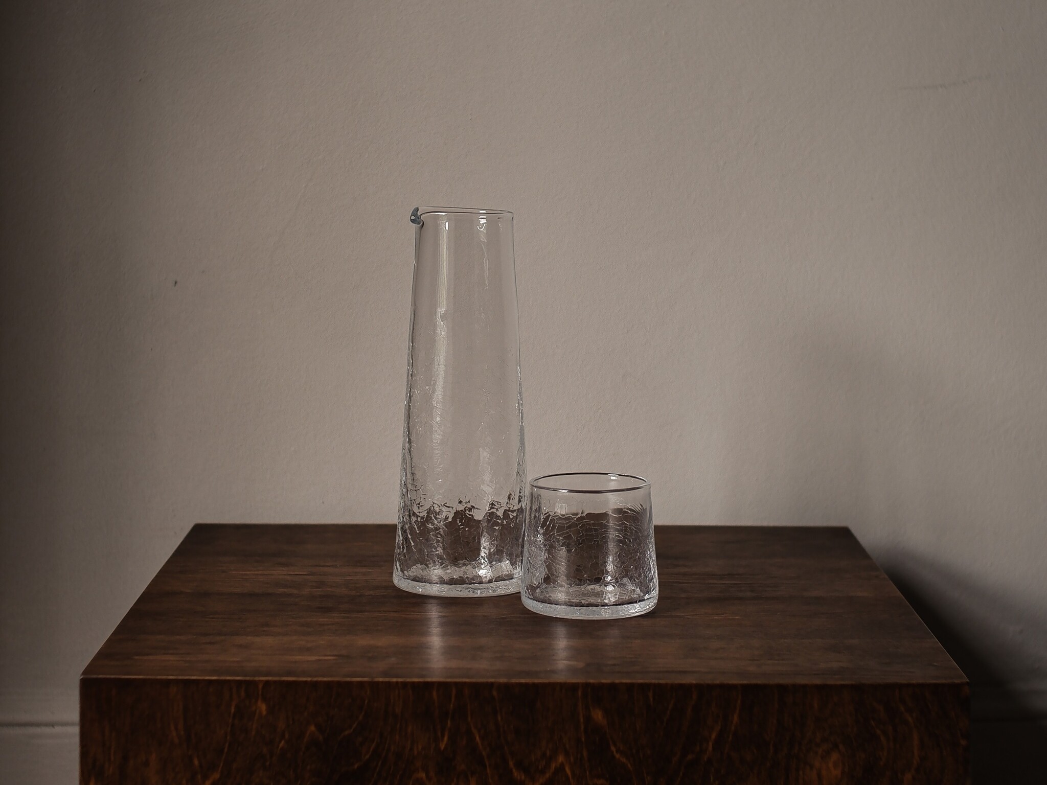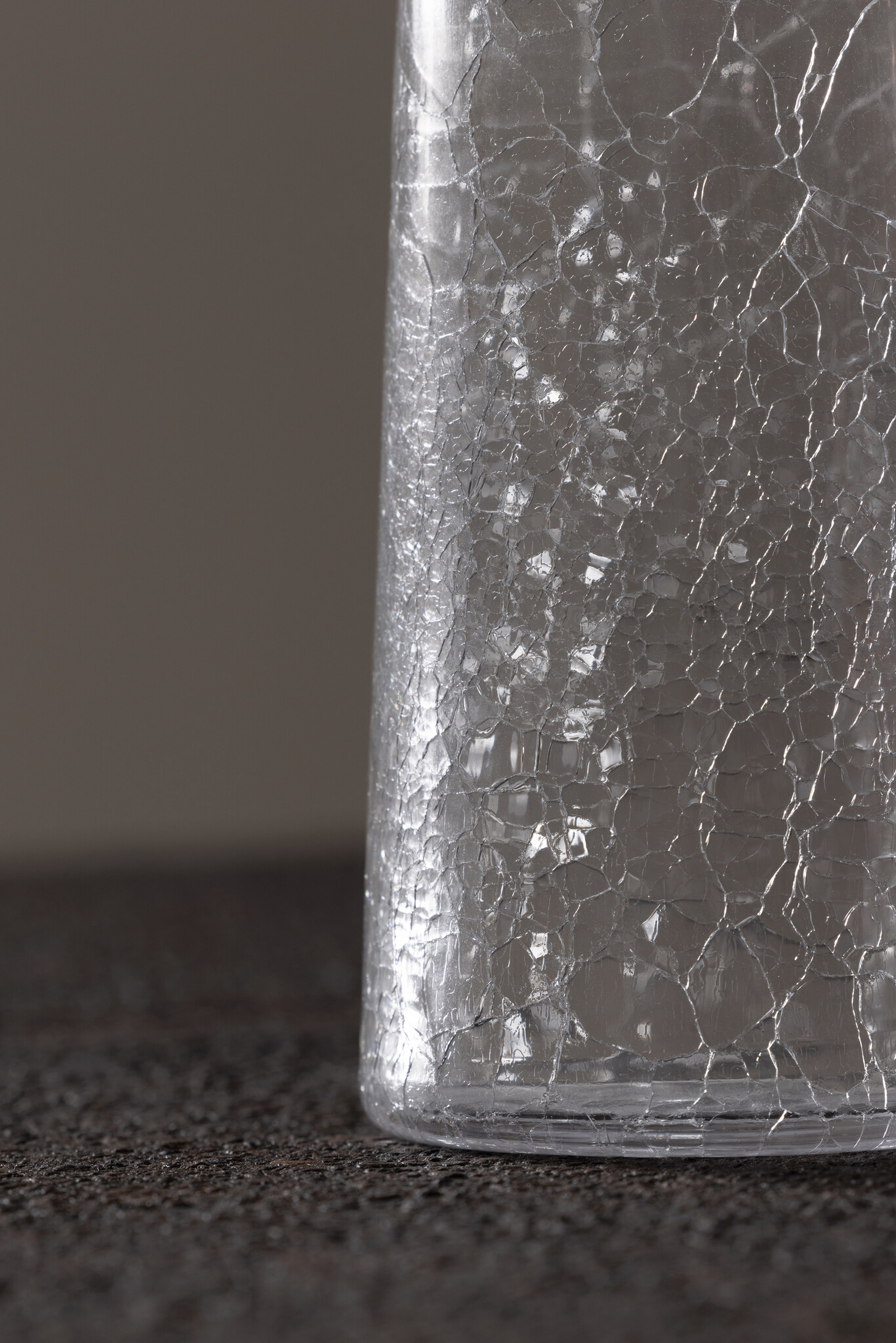 Each piece is hand-blown, then while still hot, the form is baptised in cold water, shocking the mineral with a crackled texture. Asymmetry, light-play and textural depth define the vessels’ character, while subtly tapered shapes ensure functionality and stability.