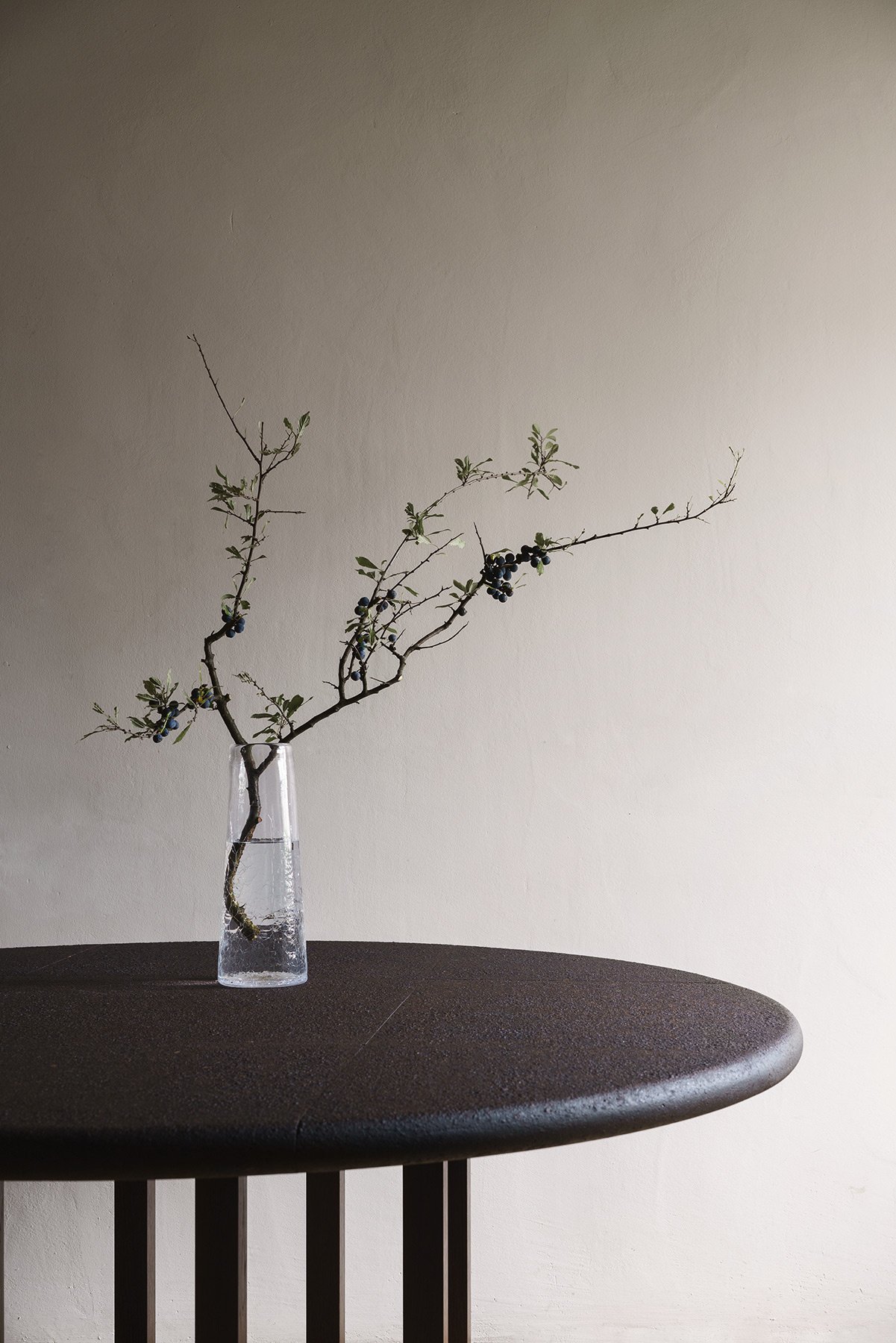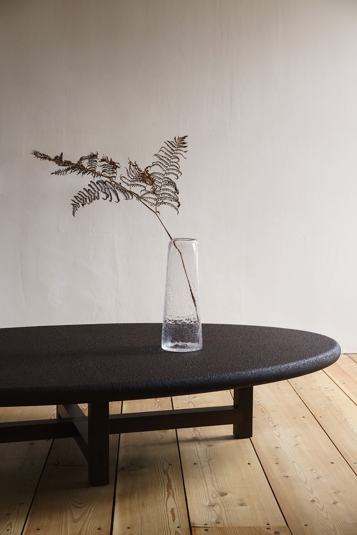 Each piece is hand-blown, then while still hot, the form is baptised in cold water, shocking the mineral with a crackled texture. Asymmetry, light-play and textural depth define the vessels’ character, while subtly tapered shapes ensure functionality and stability.