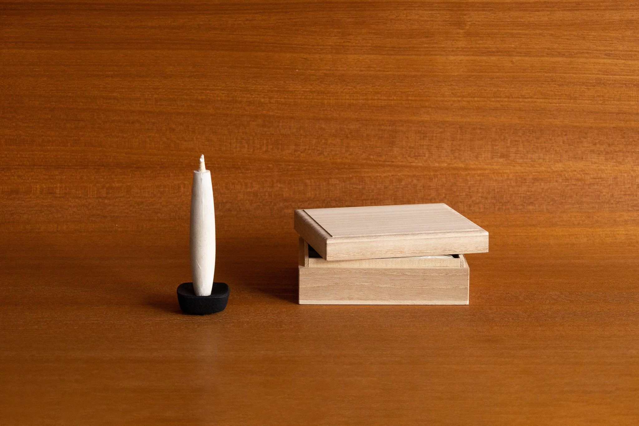 Materiality Plant-based wax candles, iron candle holder, wooden box.