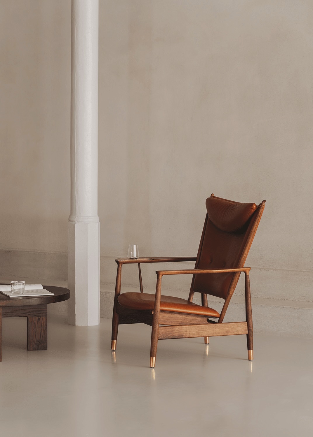 The chair is produced in exquisite American walnut of the finest quality and is upholstered by hand in leather and/or textile. Furthermore, the chair is crafted with characteristic brass feet. The Whisky Chair is overwhelmingly comfortable and invites you to partake in a special moment of immersion and enjoyment.
